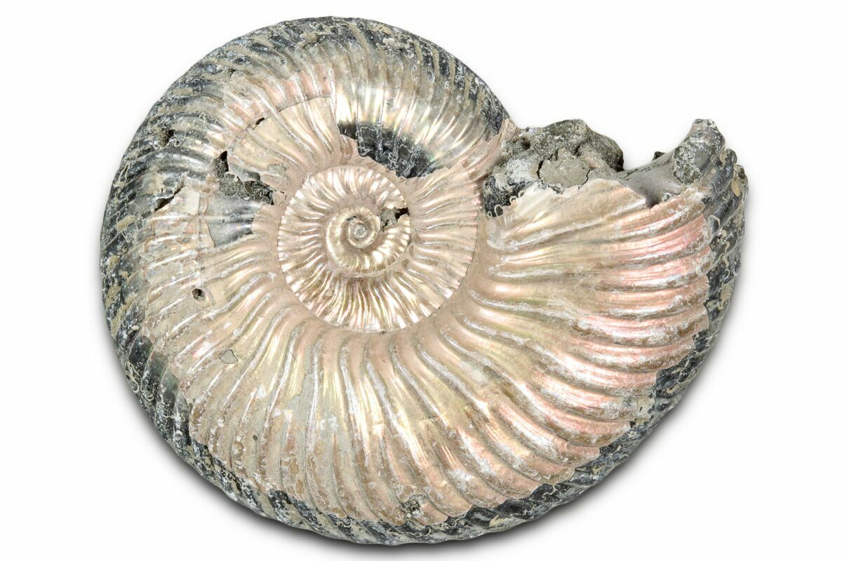 This is a gorgeous pyritized ammonite of the genus Quenstedticeras. It was collected from a Middle Jurassic age deposit along the banks of the Volga River near Saratov, Russia. You can feel the heft of the iron pyrite in the specimen when you hold it in your hand. When rotating the fossil under a light source, the shell exhibits a brilliant iridescence.