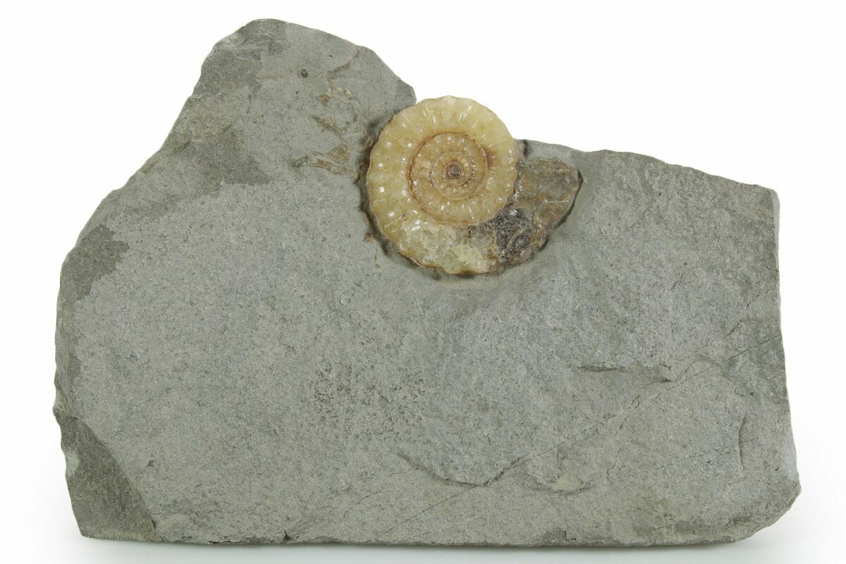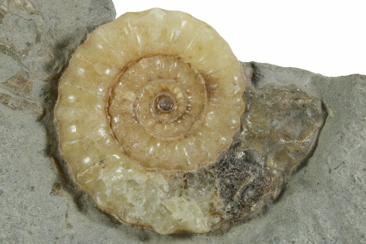 This is a gorgeous ammonite (Promicroceras planicosta) fossil collected from Dorset, England. The ammonite measures 1.3" wide and has had the limestone removed from each side of the specimen. Because of this preparation, the natural translucence of the ammonite can be seen, especially when the ammonite is backlit. A photo of the ammonite backlit can be seen up above.