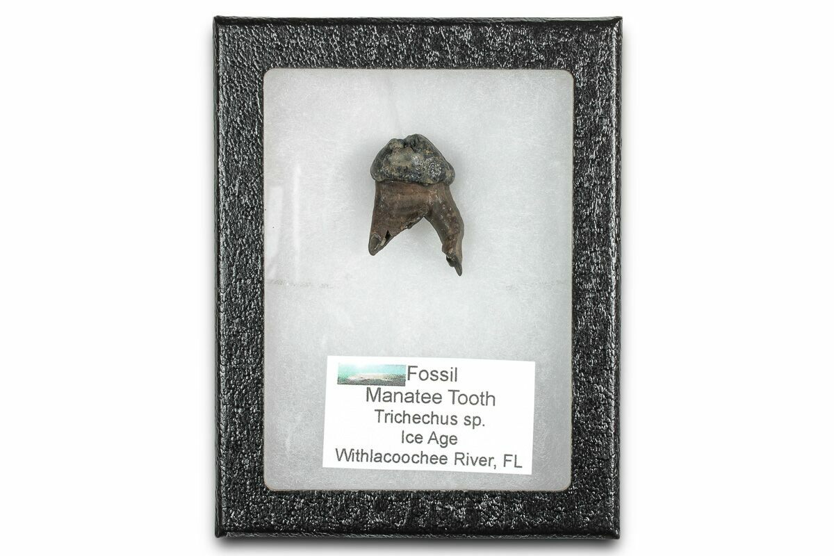 This is a 1.3" long fossilized manatee tooth collected from a Late Pleistocene-aged deposit in the Withlacoochee River of Florida. It's in great condition with an intact crown and preserved roots.