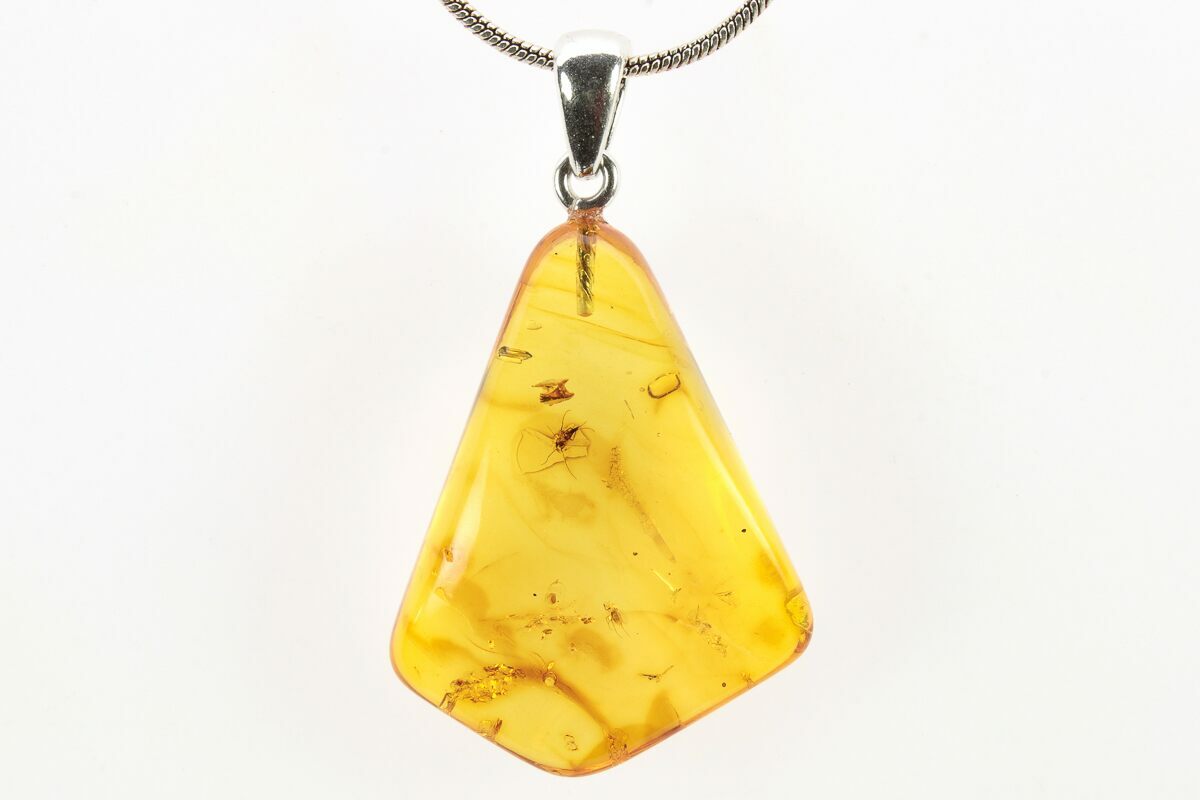 This is a 1.3" tall (including loop) pendant made from 44 million year old Baltic amber. Within the amber, two small fossil flies (order Diptera) can be seen. A loop has been attached to the amber, along with a secondary ring for the included 24" silver plated snake chain to complete the necklace.