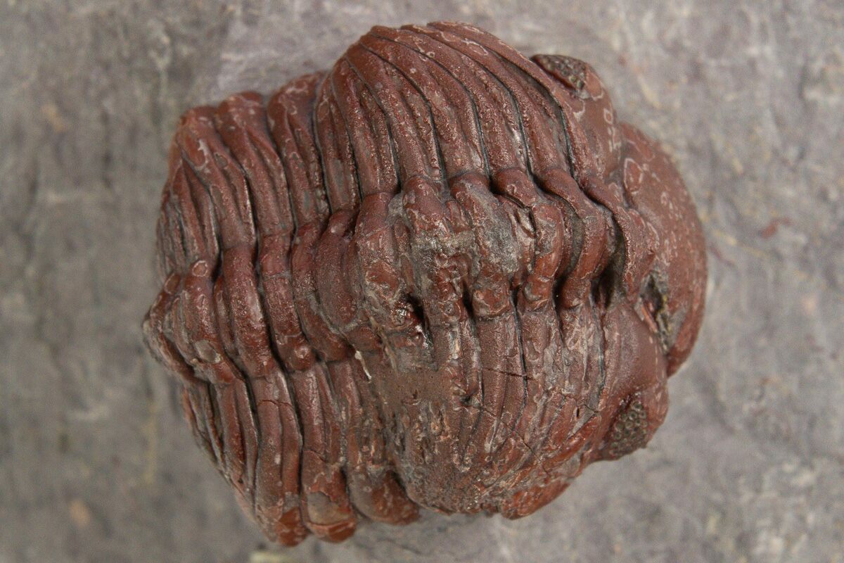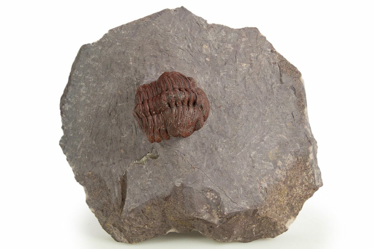 This is a 1.3" long (if outstretched), red Morocops trilobite from Hmar Laghdad, Morocco. The shell preservation is a deep red coloration which is unique to the location. There is about 2% restoration along a repaired crack.