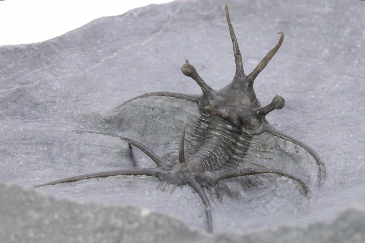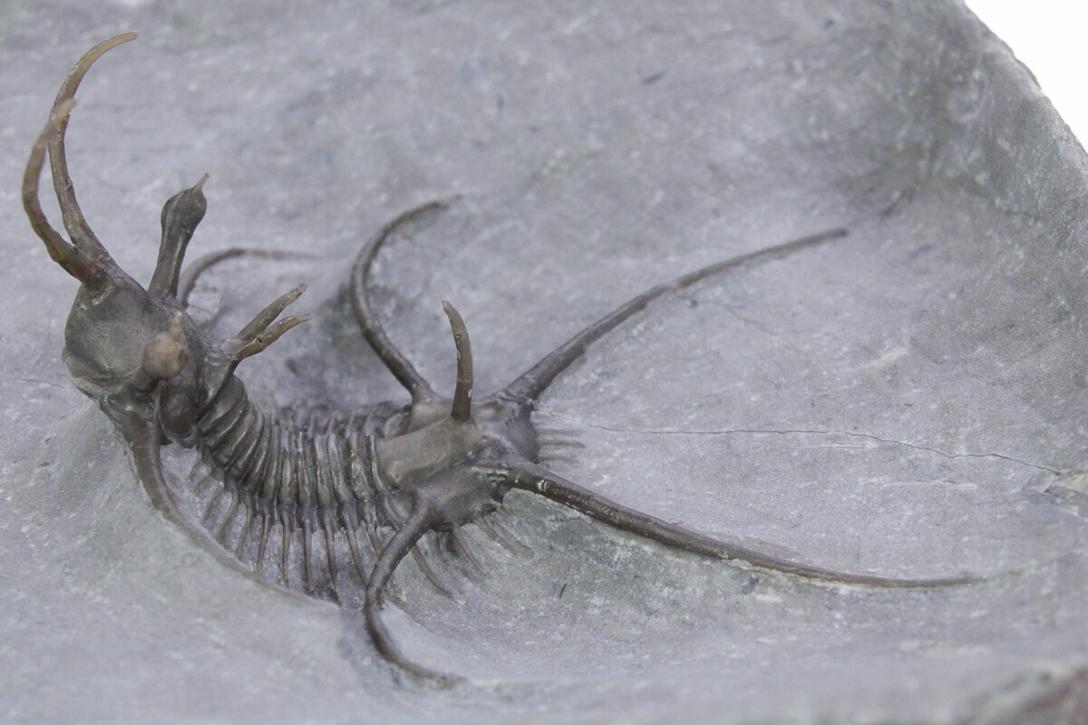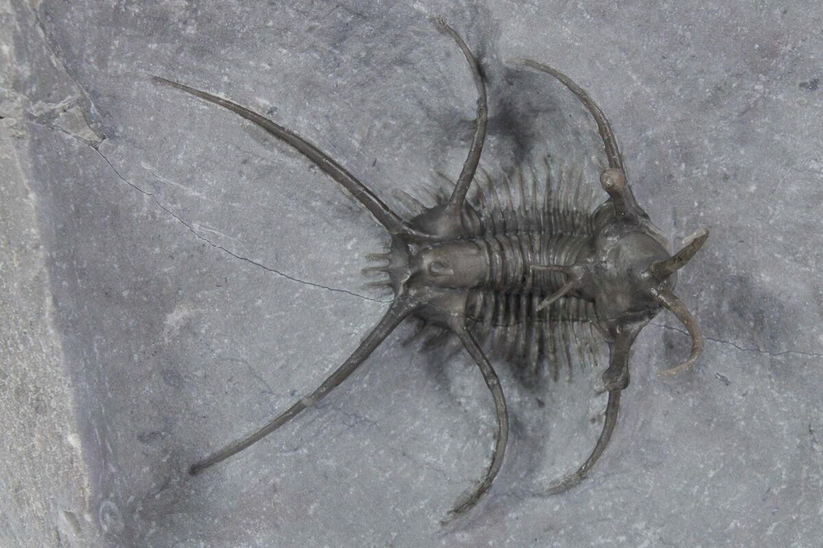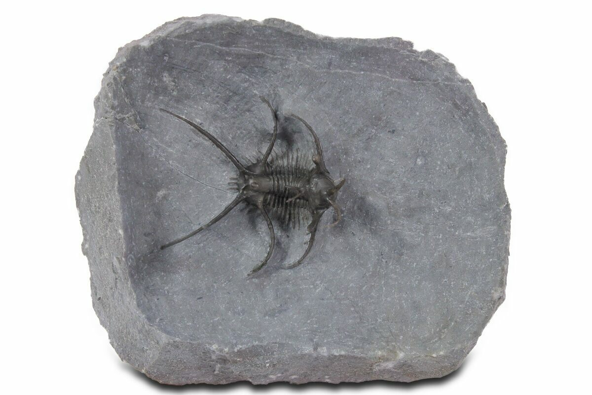 This is a 1.3" long, spiny Ceratarges aries collected from the El Otfal Formation near Zireg, Morocco. It is very well prepared with free standing spines. The only restoration is p portion of one of the spines coming off of the head as well as the tips of three pleural spines on the right side.