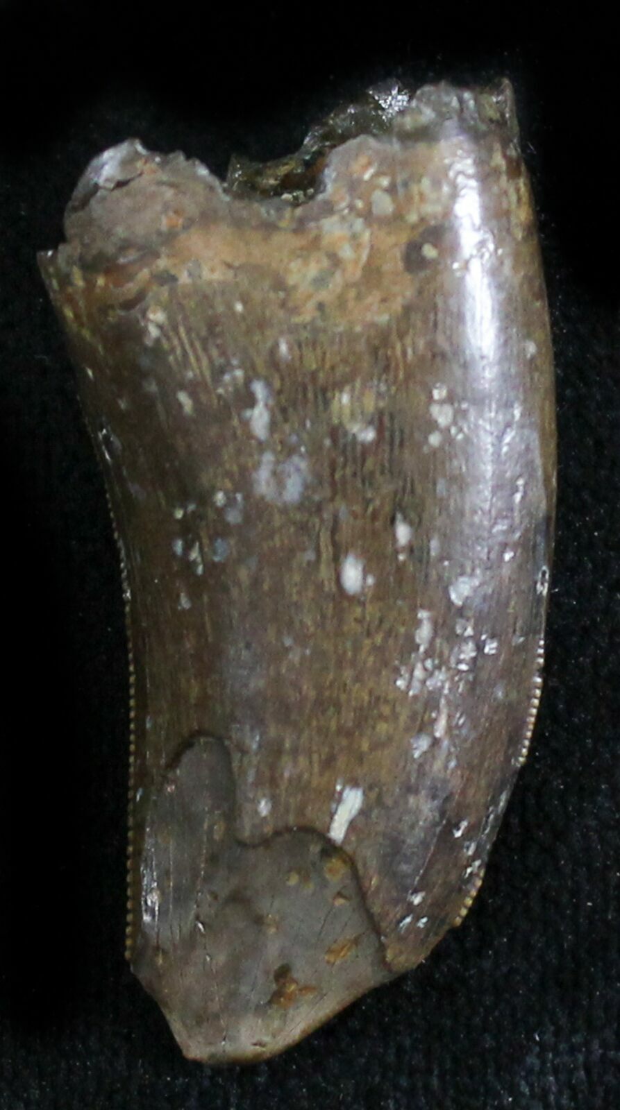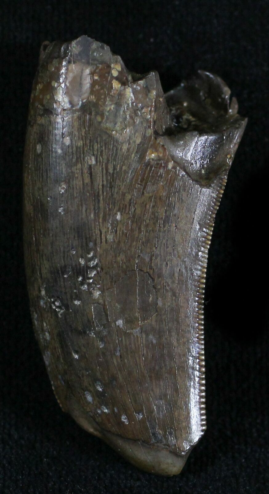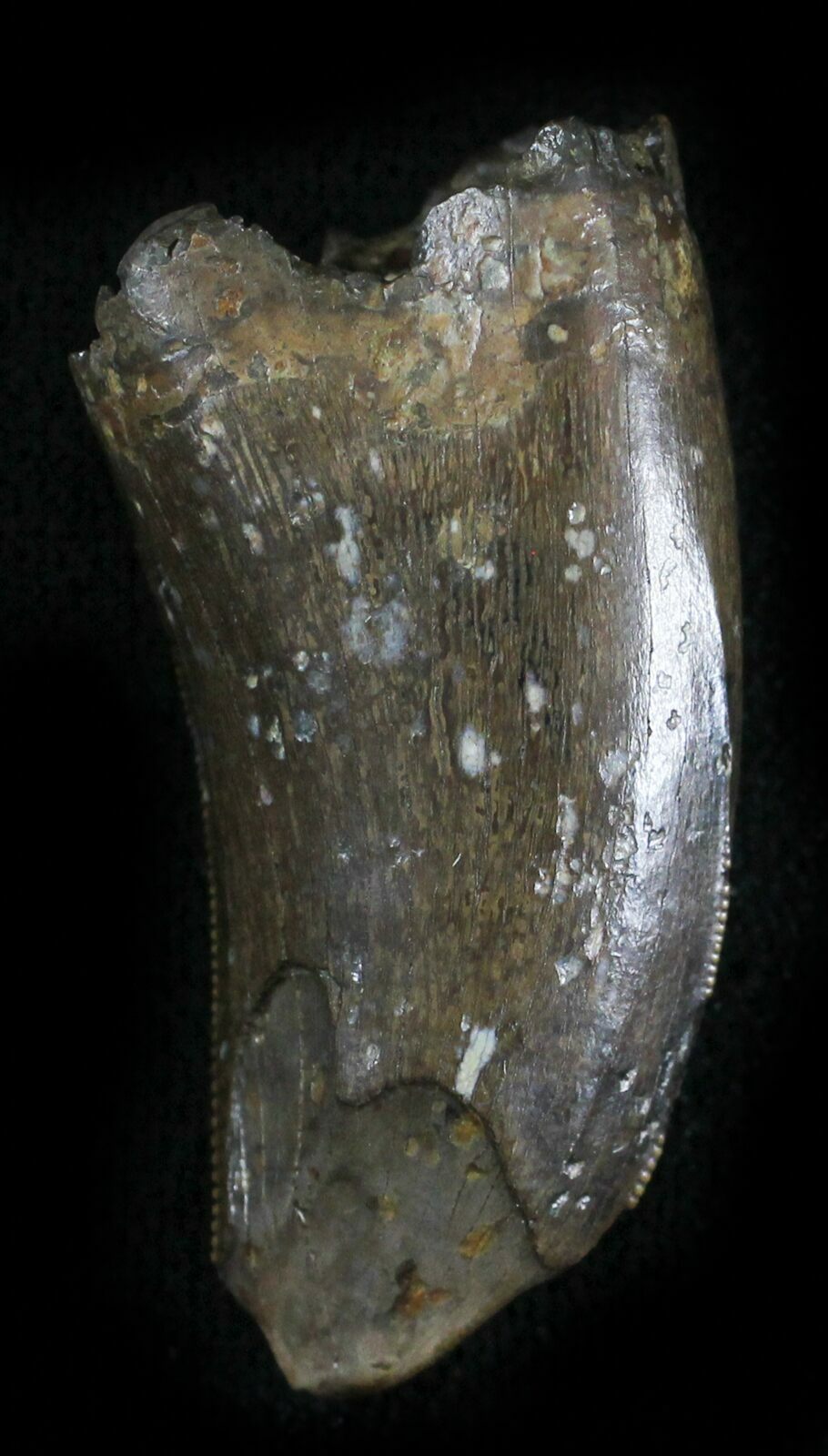 This is a 1.31" long Tyrannosaur tooth from the Hell Creek Formation in Powder River Montana. The tip has been worn down due to rubbing against another tooth in the dinosaur's mouth. Serrations on the inner edge are in great shape. It's a larger, more robust tooth so it could either be a small T-Rex or a large Nanotyrannus.