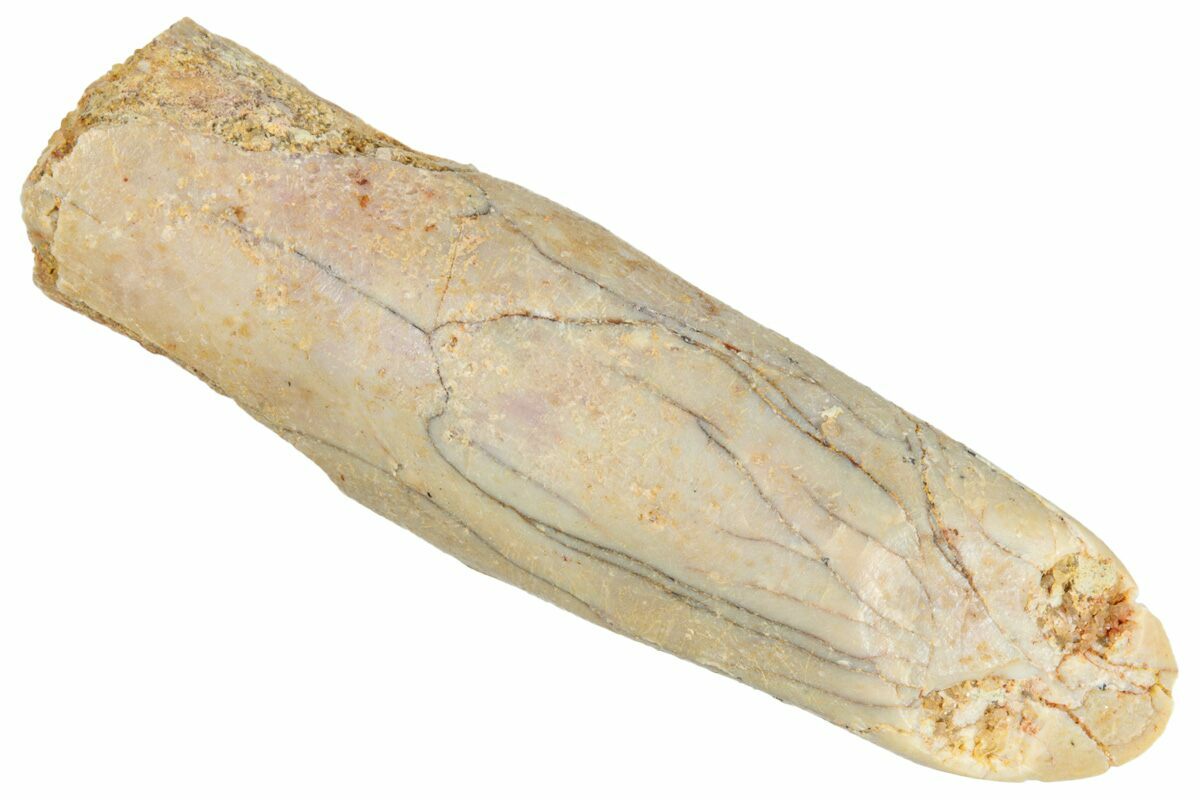 This is a 1.32" long tooth of the large Moroccan diplodocid sauropod, Rebbachisaurus garasbae. It comes from the Late Cretaceous, Kem Kem of Morocco, home to such meat eating giants as Spinosaurus and Carcharodontosaurus.