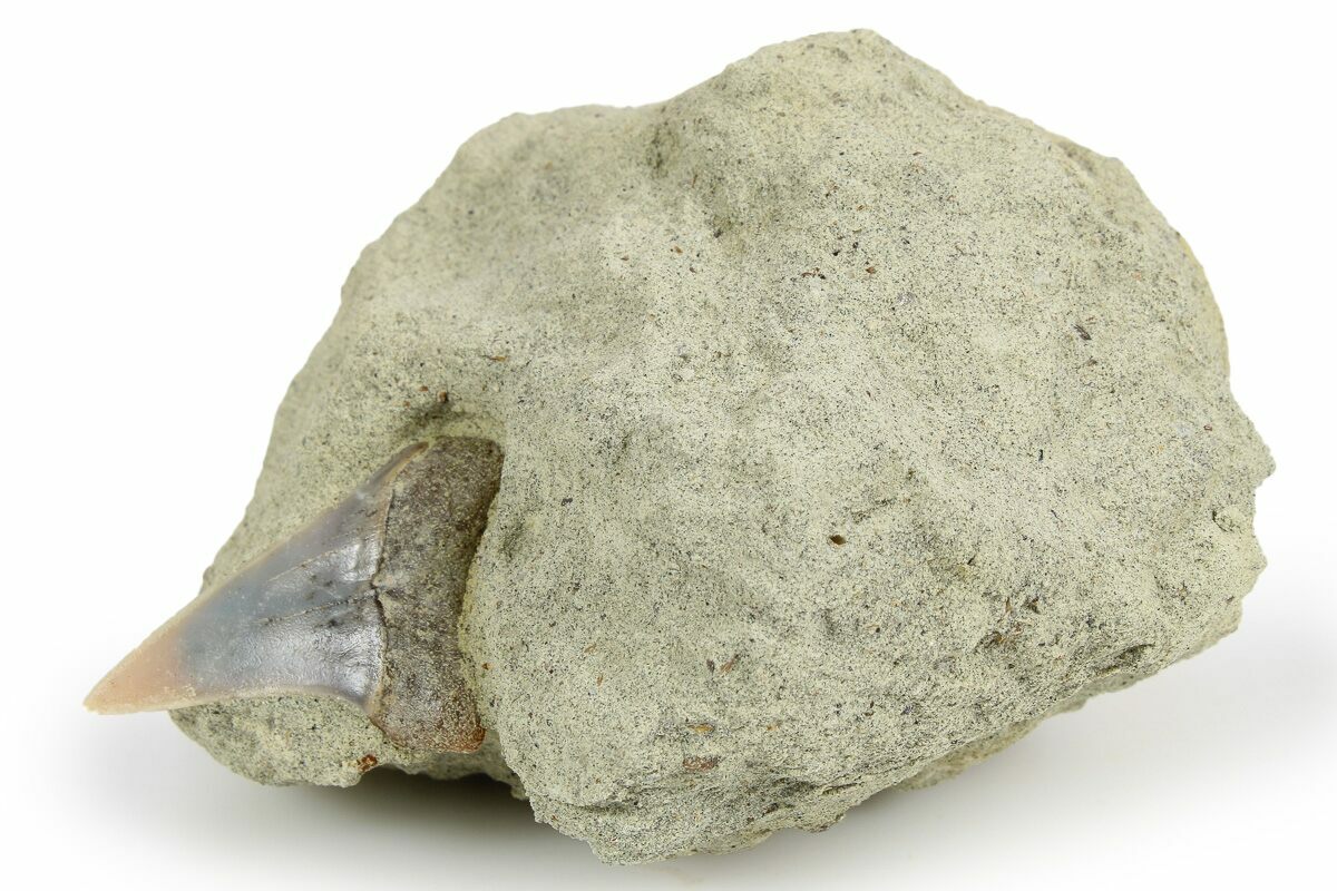 1.28" Narrow White Shark Tooth Fossil on Sandstone - Bakersfield, CA