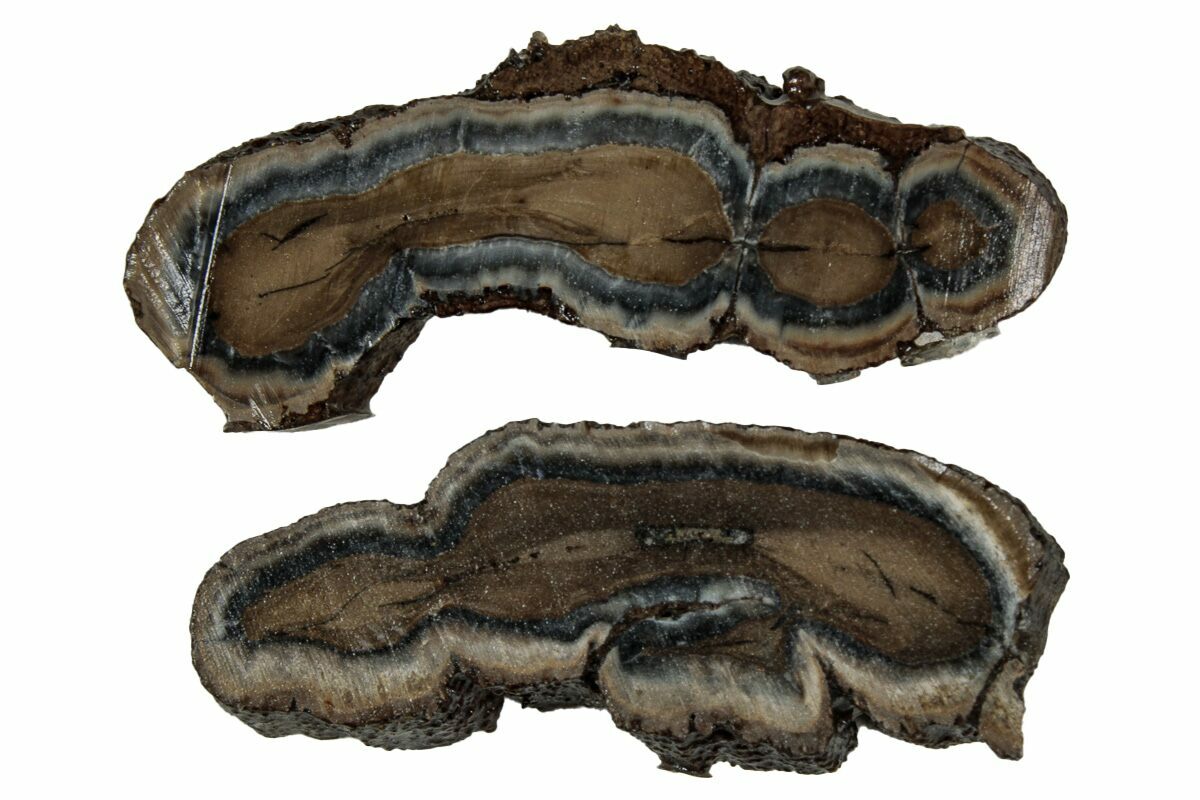 These are two cross-sectional slices of a Columbia Mammoth (Mammuthus columbi) molar collected from the coastal region of South Carolina. They come in a Riker mount display case.