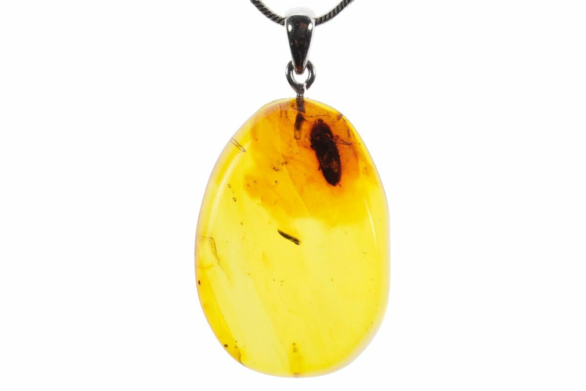 This is a 1.35" tall (including loop) pendant made from 44 million year old Baltic amber. Within the amber, a nicely preserved fossil beetle (order Coleoptera) can be seen. A loop has been attached to the amber, along with a secondary ring for the included 24" silver plated snake chain to complete the necklace.