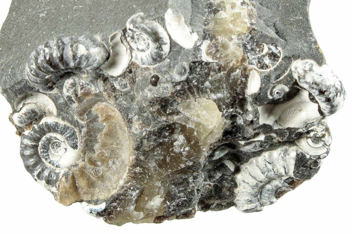 The site that produces this material is no longer accessible. Because of this, these specimens are becoming increasingly harder to obtain. The piece has been painstakingly prepared with mechanical tools to expose all of the individual ammonite fossils.
