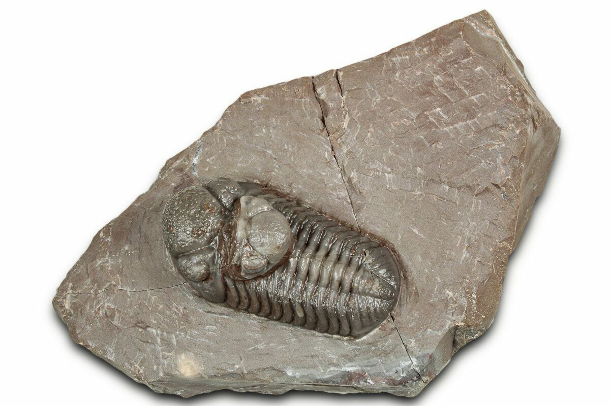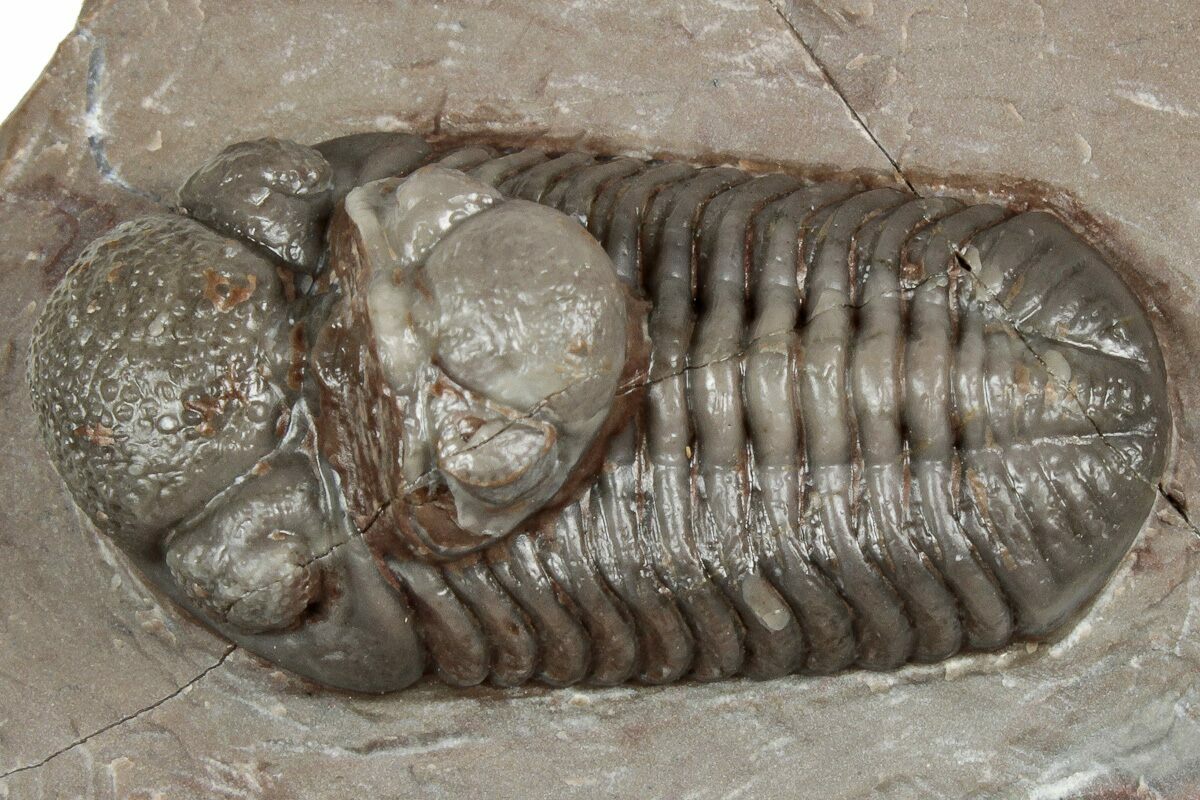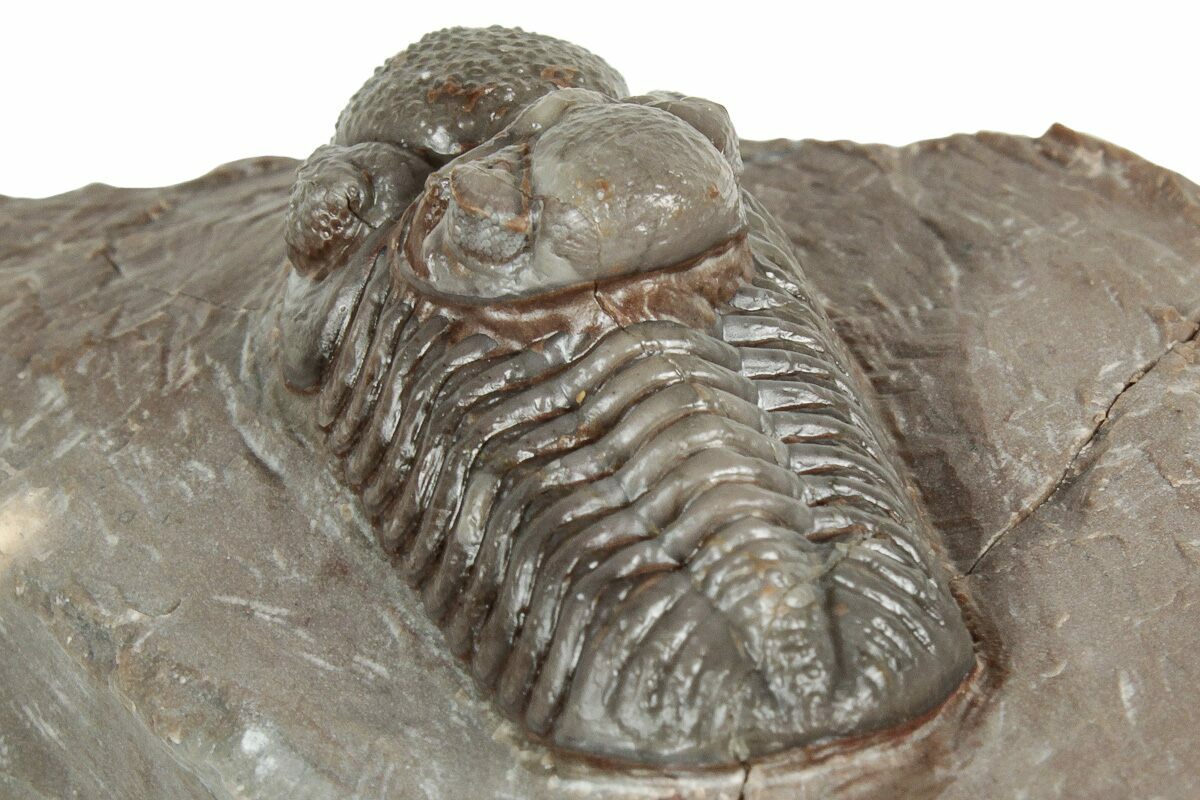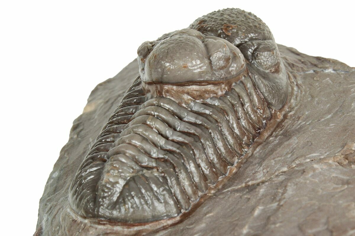 This is a 1.4" long, prone Austerops trilobite collected from the Bou Tchrafine Formation near Jorf, Morocco. Nice preparation with preserved eye facets in both eyes and a naturally associated Austerops cephalon still attached.