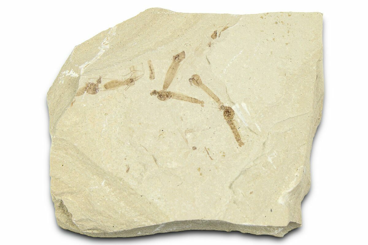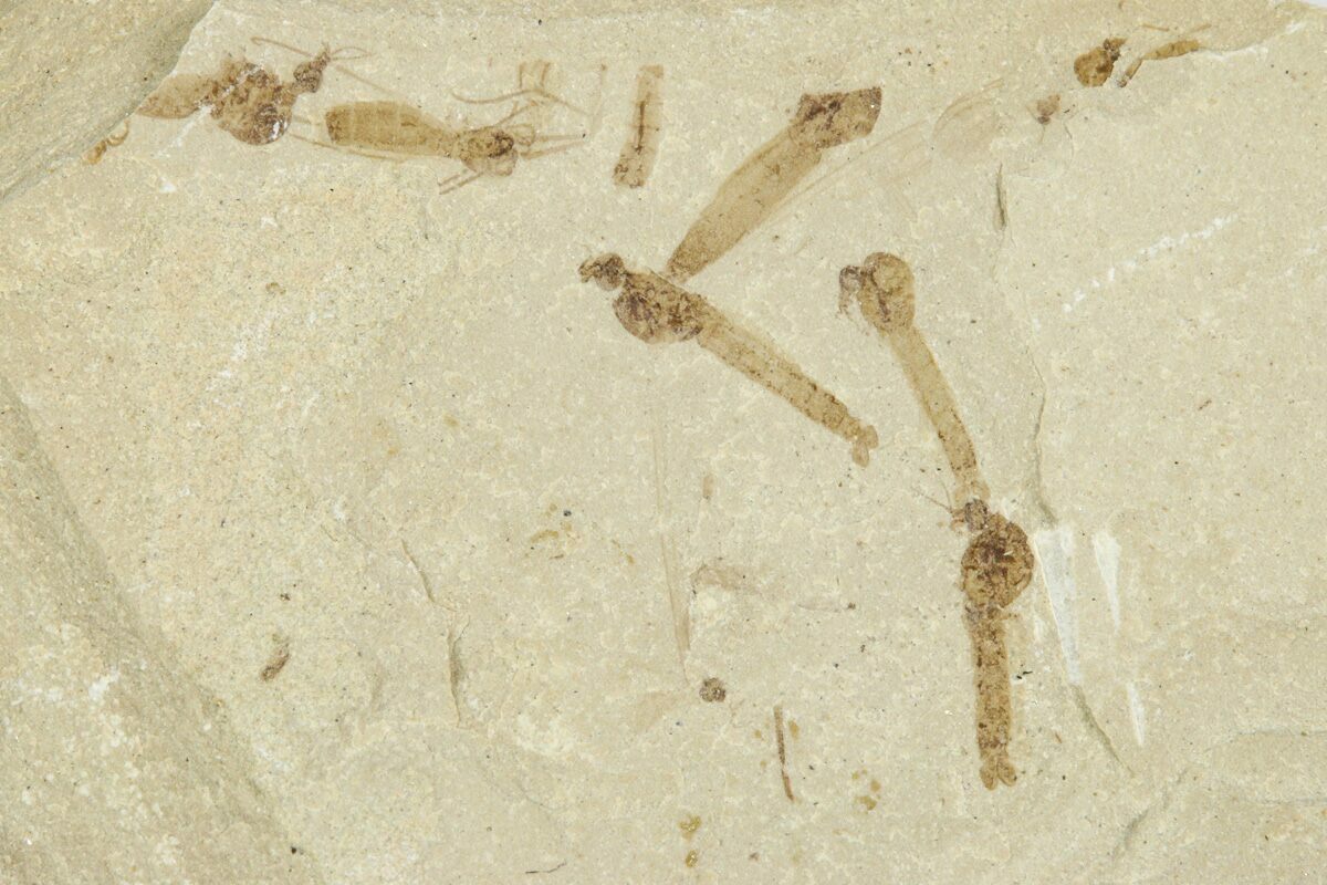 This is a 1.4" wide mortality plate featuring several detailed crane flies (family Tipulidae), collected from the Green River Formation of Utah. While the Green River Formation is best know for its fish fossils, other areas produce incredible plant fossils and insect fauna.