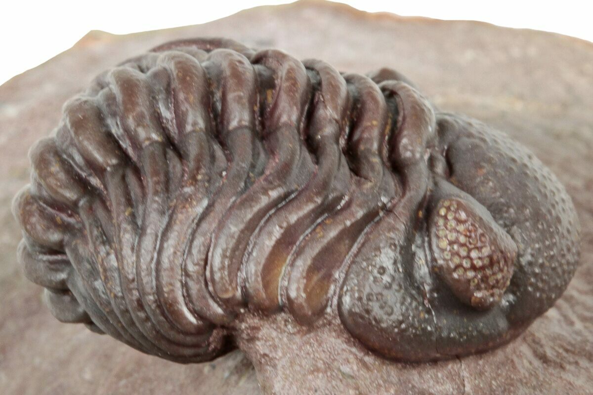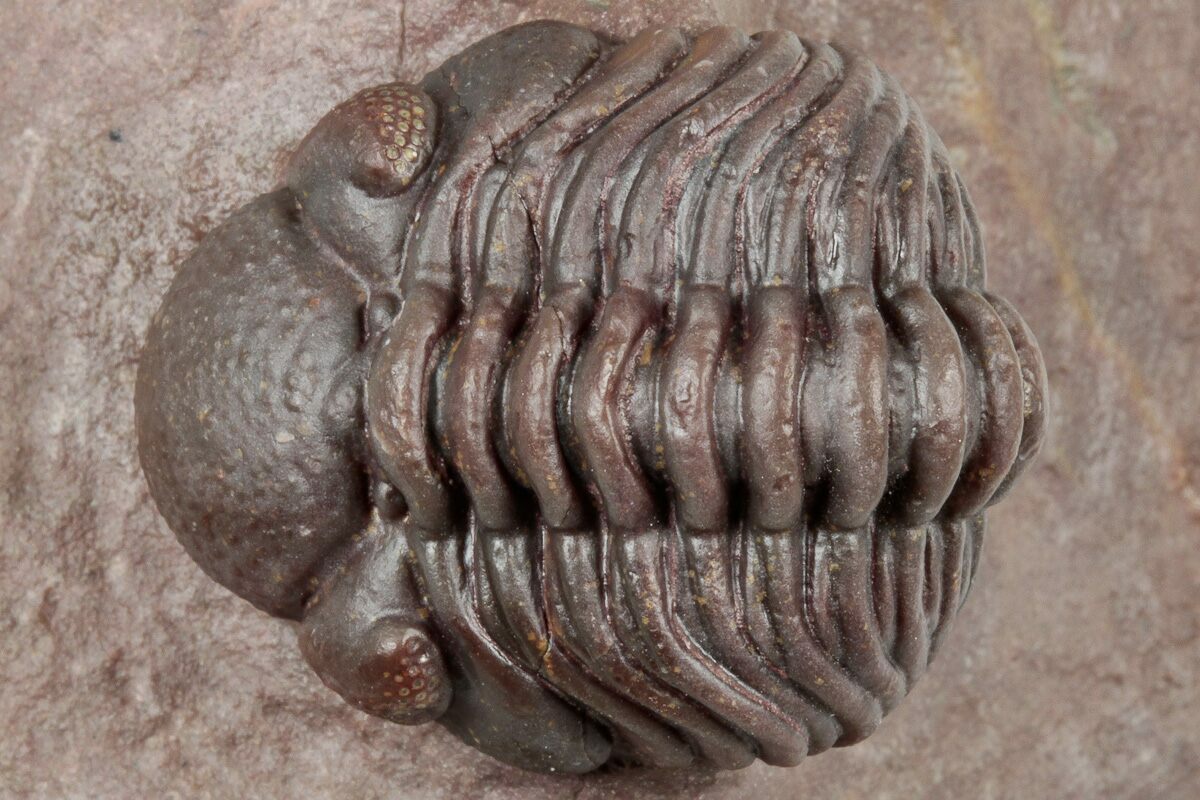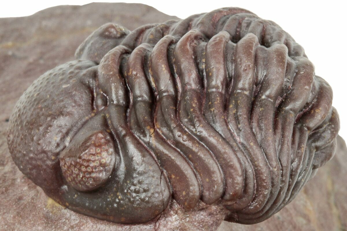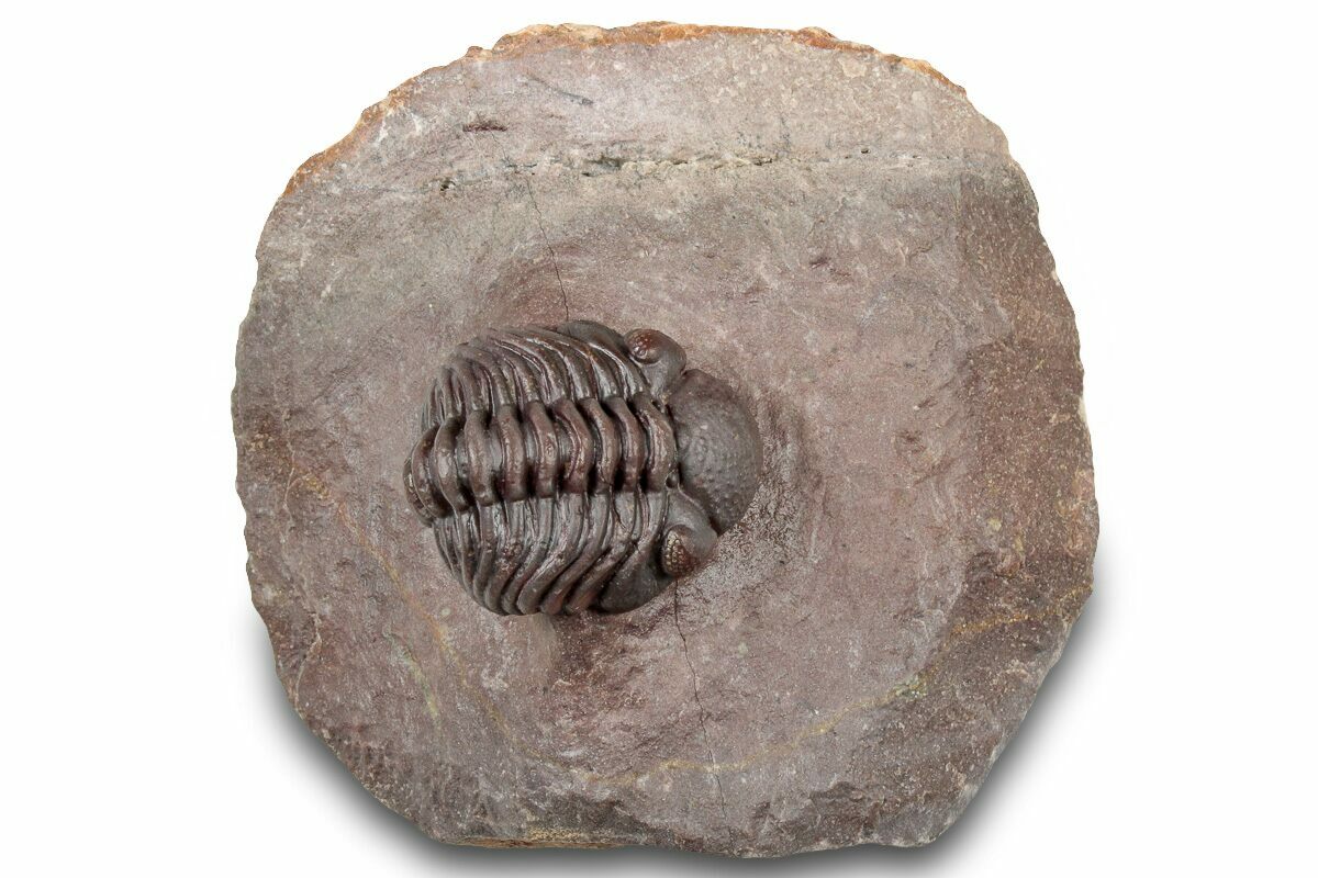 This is a beautiful, curled 1.4" long, red Austerops granulops trilobite from Hmar Laghdad, Morocco. The shell preservation is a deep red coloration which is unique to the location.