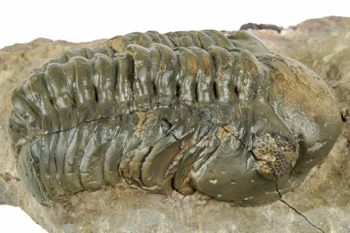 This is a detailed, 1.4" long Reedops trilobite collected near Atchana, Morocco. It has a lot of surface detail including, visible, preserved eye facets in its eyes. This specimen has about 1-2% shell restoration along repaired cracks.