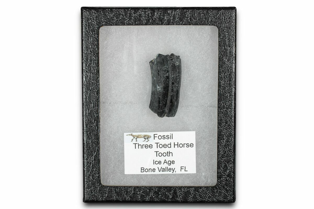 This is a 1.4" long Pliocene/Miocene-aged fossil three-toed horse tooth collected in Bone Valley, Florida. These teeth are commonly found associated with fossils from many other Late Miocene and early Pliocene (ice age) mammals. It is accompanied by a riker mount display case.