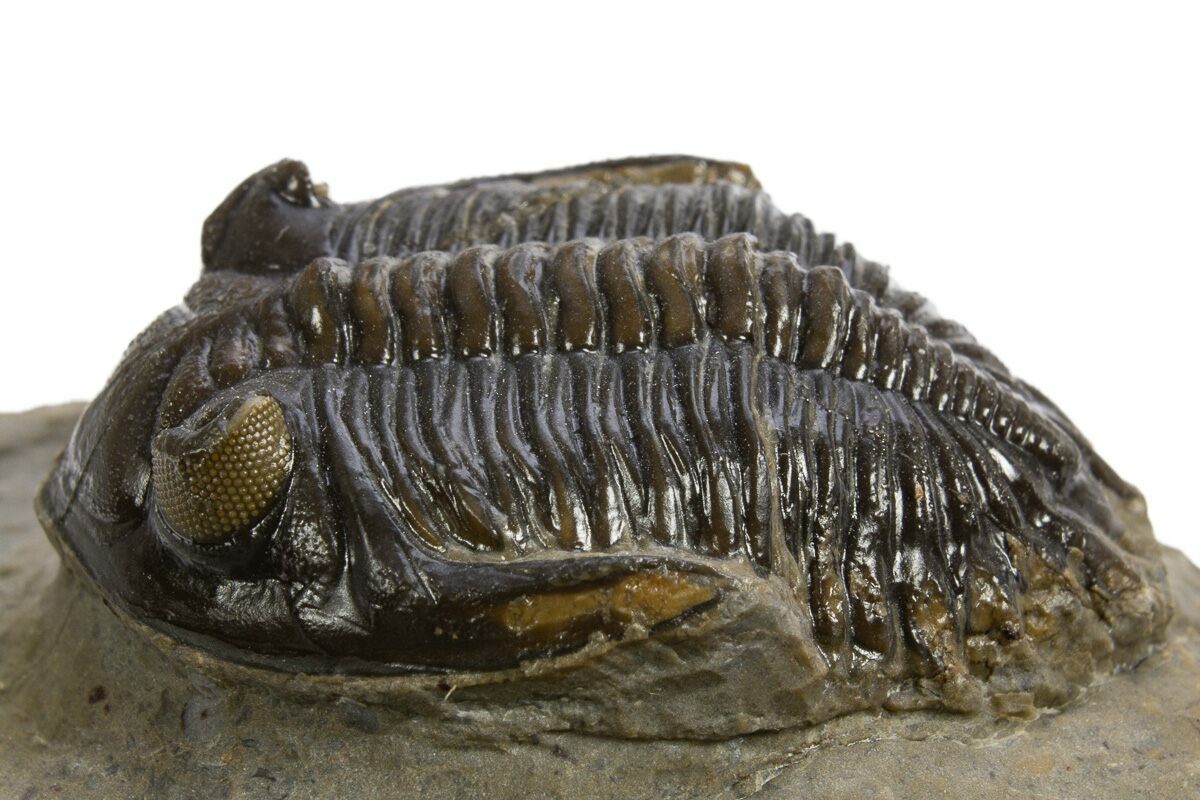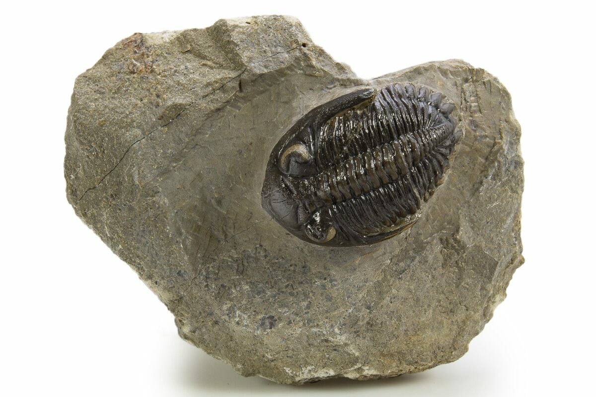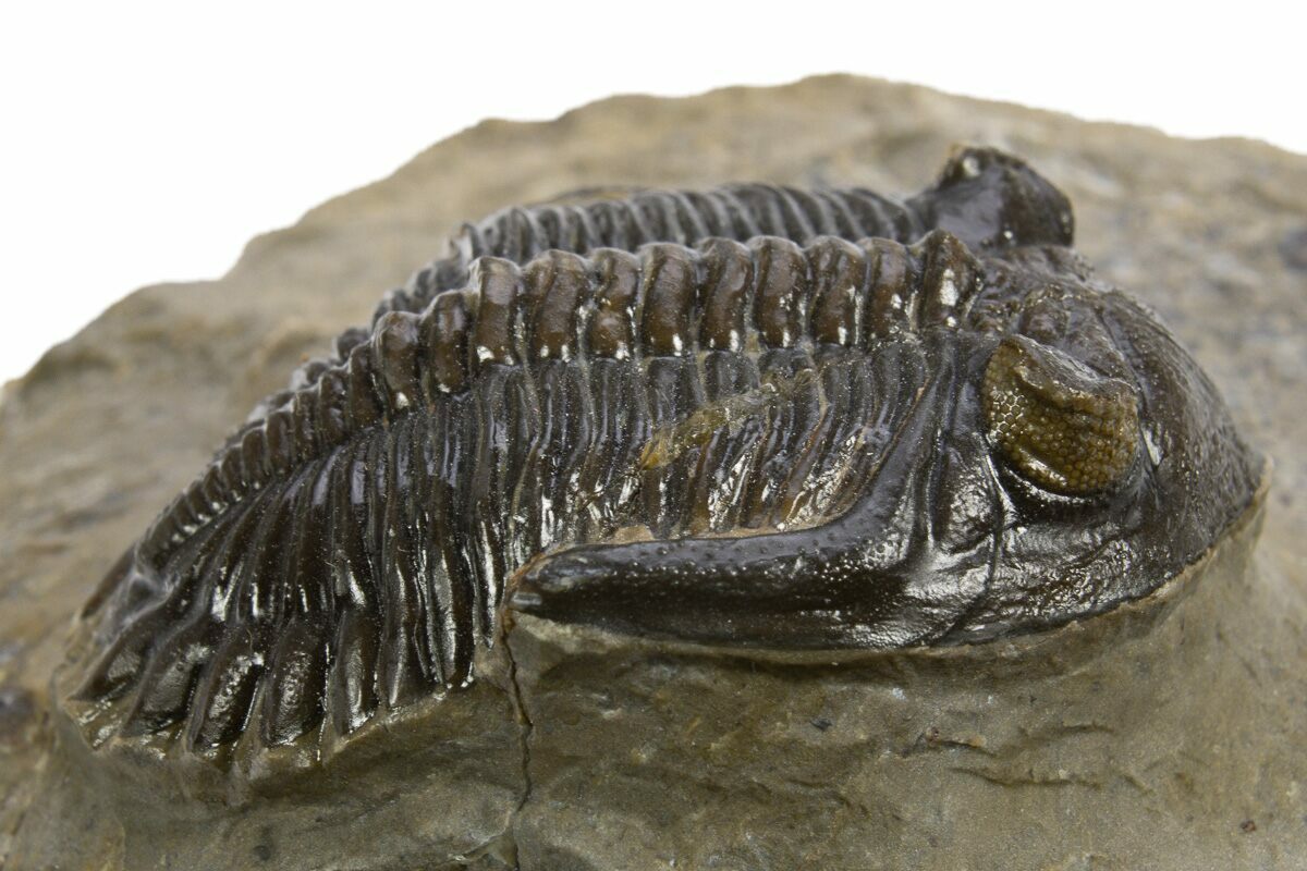 This is a 1.4" long Hollardops trilobite fossil quarried near Ofaten, Morocco. It has excellent eye facet preservation in both eyes It has about 1% restoration along repaired cracks.