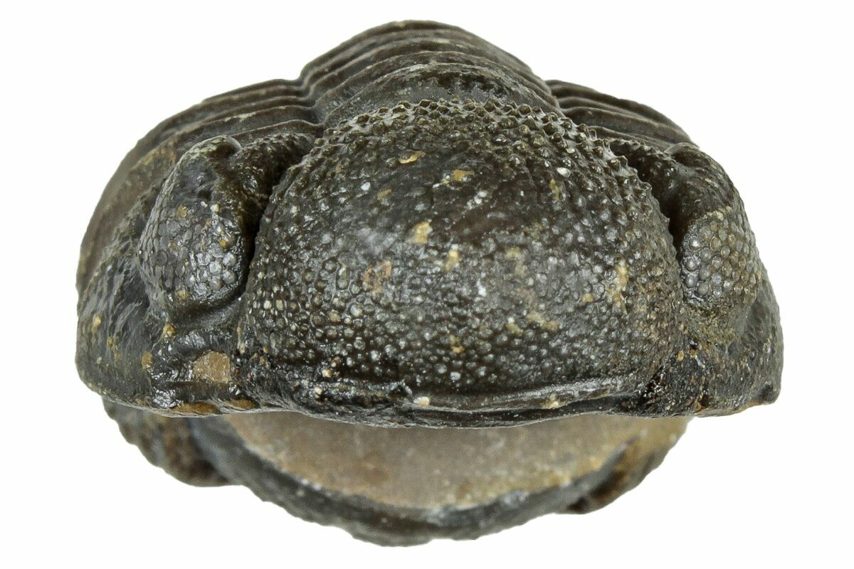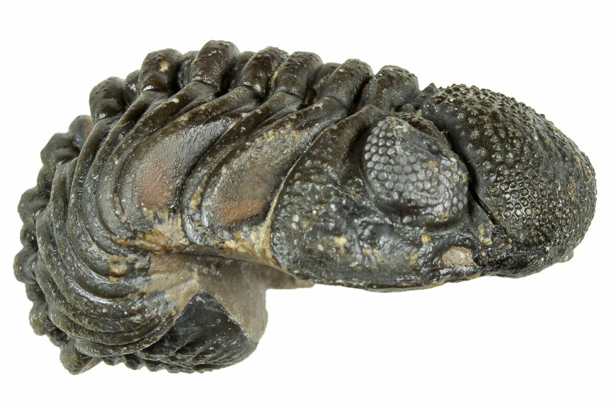 This is a curled, 1.4" long Morocops trilobite from Morocco. It has a very bumpy shell and visible eye facet detail in both eyes.