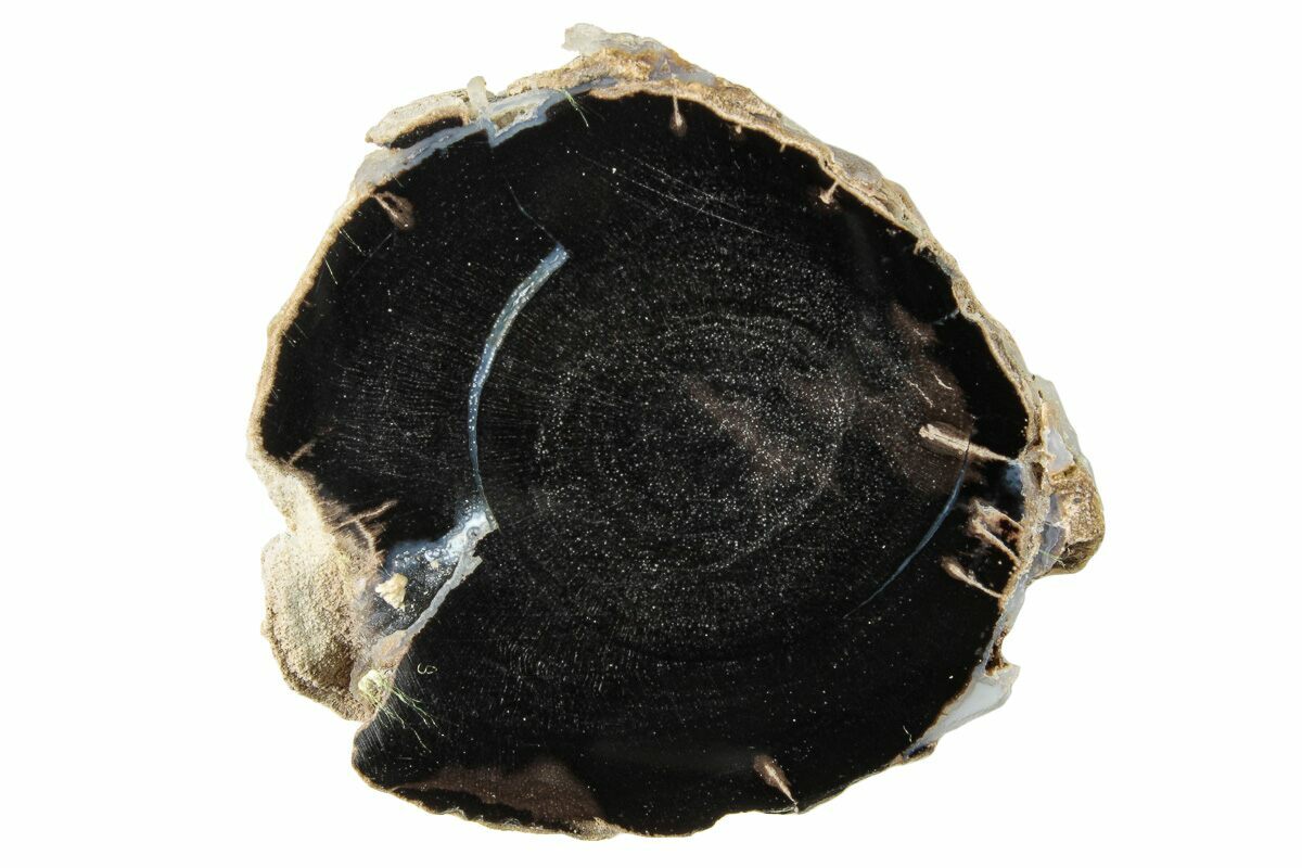 This is a 1.4" wide, polished round of a petrified wood (Schinoxylon) limb from the famous "Blue Forest" in Wyoming. It shows amazing grain detail and agate inclusions. This colorful slice of petrified wood has been highly polished to a glossy finish on one side.