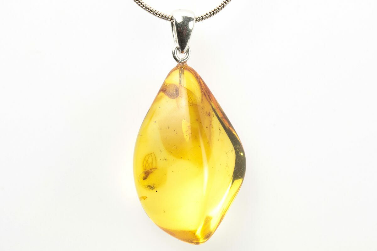 This is a 1.4" tall (including loop) pendant made from 44 million year old Baltic amber. Within the amber, a fossil spider (order Araneae) can be seen. A loop has been attached to the amber, along with a secondary ring for the included 24" silver plated snake chain to complete the necklace.