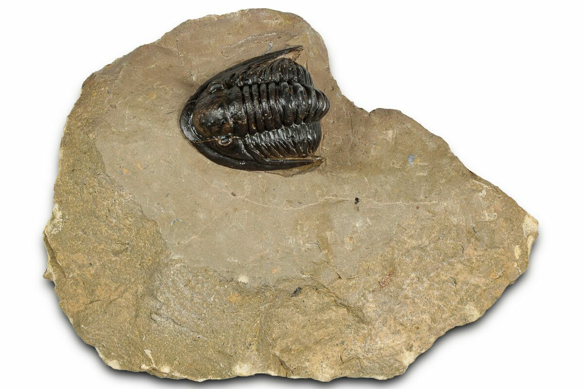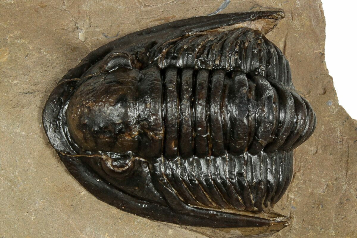 This is an uncommon type of proetid trilobite from Morocco, Dalejeproetus. It would measure about 1.4" long if outstretched and is well prepared. It has about 5% restoration in total.