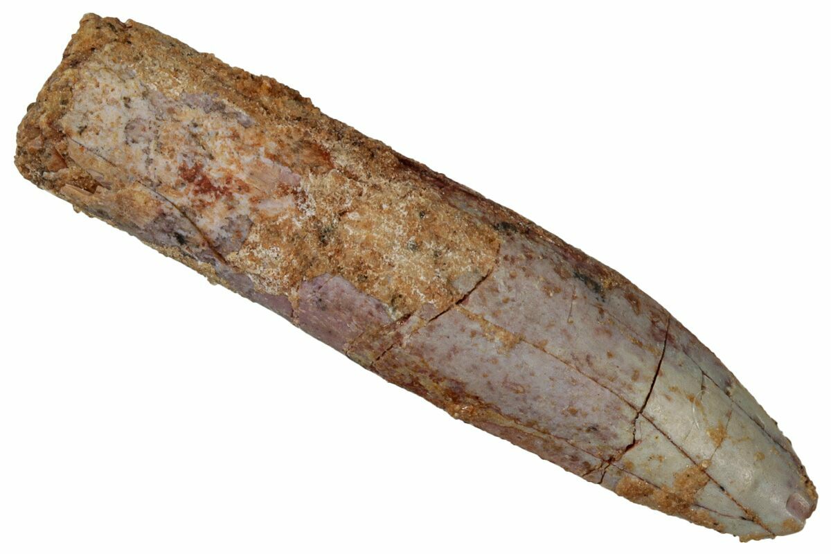 This is a 1.42" long tooth from a Moroccan titanosaur that is currently unidentified. It comes from the Late Cretaceous, Kem Kem Beds of Morocco, home to such meat eating giants as Spinosaurus and Carcharodontosaurus.