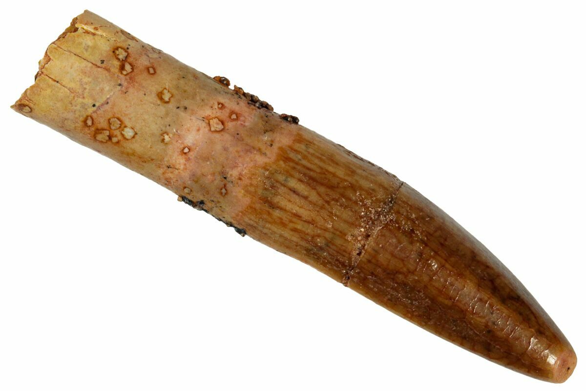 This is a 1.42" long tooth from a Moroccan titanosaur that is currently unidentified. It comes from the Late Cretaceous, Kem Kem Beds of Morocco, home to such meat eating giants as Spinosaurus and Carcharodontosaurus.