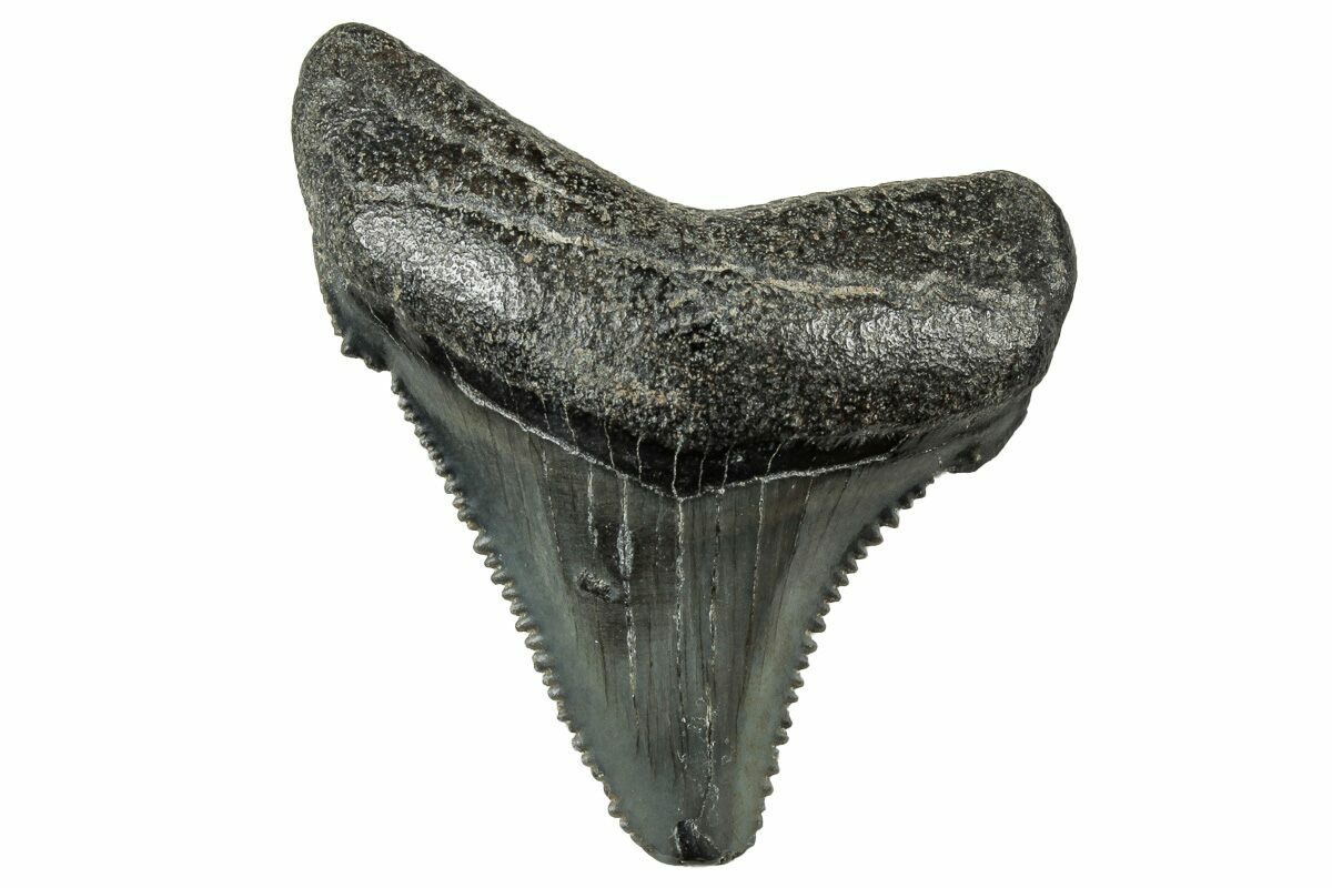 This is a serrated, 1.42" long fossil Otodus angustidens shark tooth. Angustidens is believed to be an ancestor of the fearsome megalodon shark, though it did not grow nearly as large.