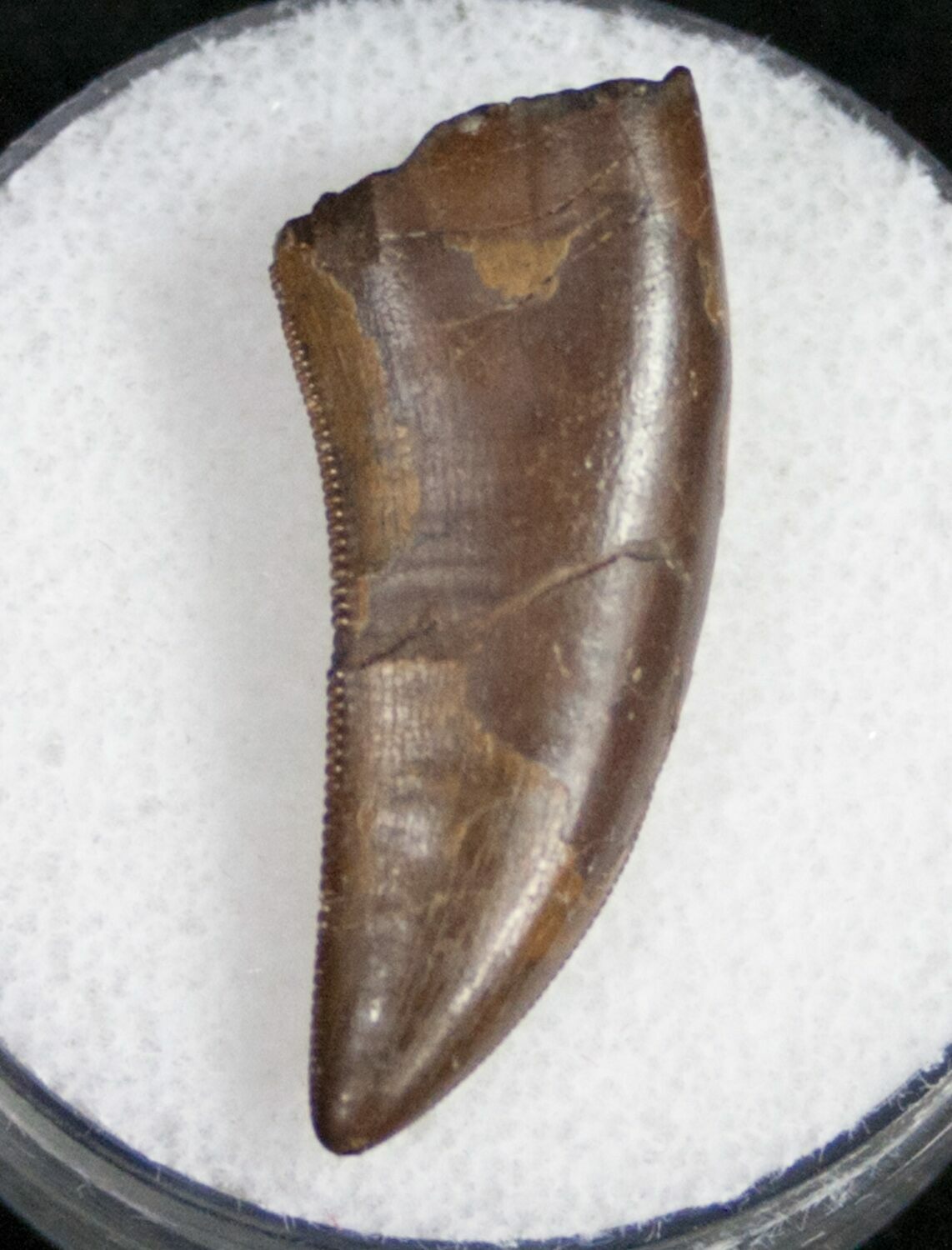 This is nice 1.17" long Nanotyrannus lancensis tooth with beautiful enamel preservation and fine serrations. There is some natural feeding wear to the tip but the serrations are in nice shape. There is a repaired crack in the middle of the tooth with a small amount of restoration.