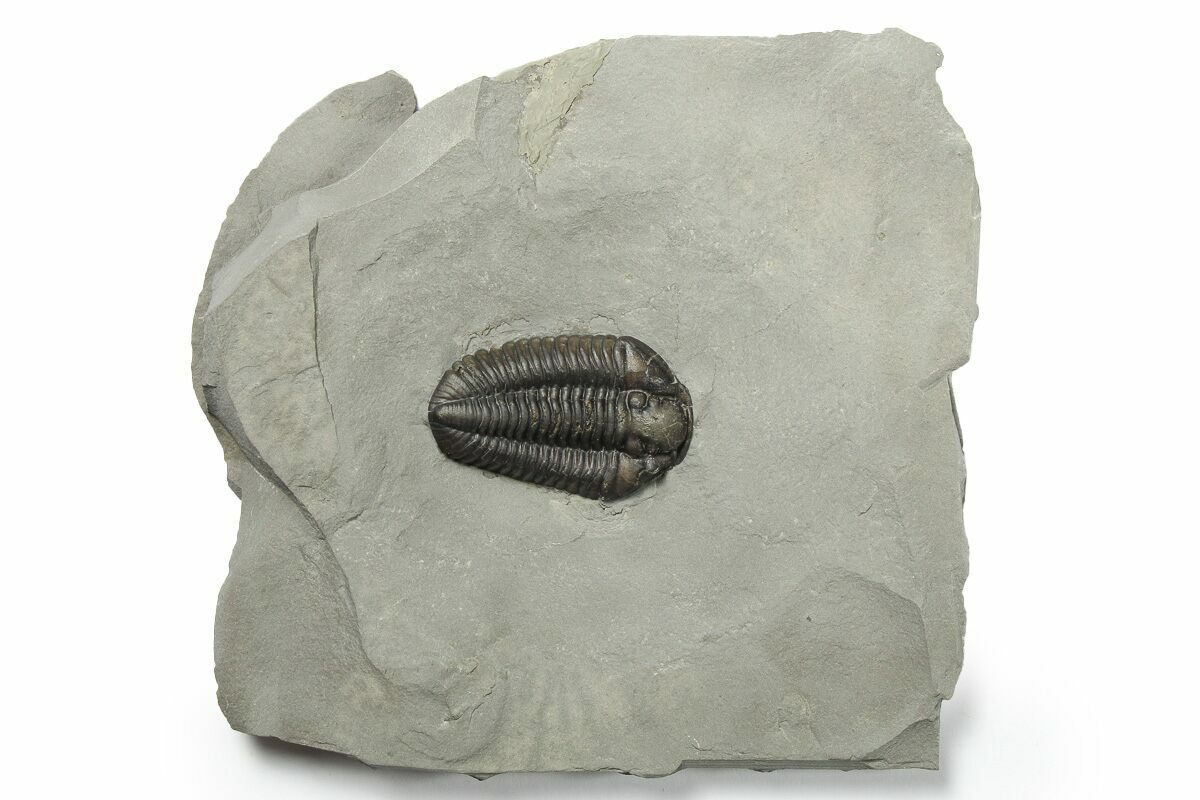 This is a 1.5" long, perfectly prone, Calymene niagarensis trilobite from the Rochester Shale near Middleport, New York.