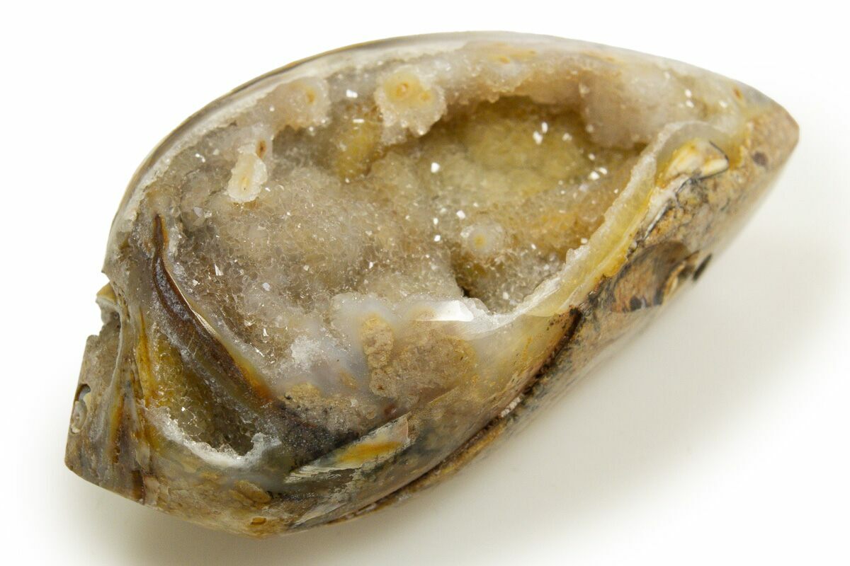 This is a stunning chalcedony replaced gastropod fossil from Betul, India. This specimen has been polished to reveal the once hollow cavity of the shell that has been filled with a pocket of beautiful druzy quartz crystals. It has also been cut flat on the back side so that it displays nicely on a flat surface.