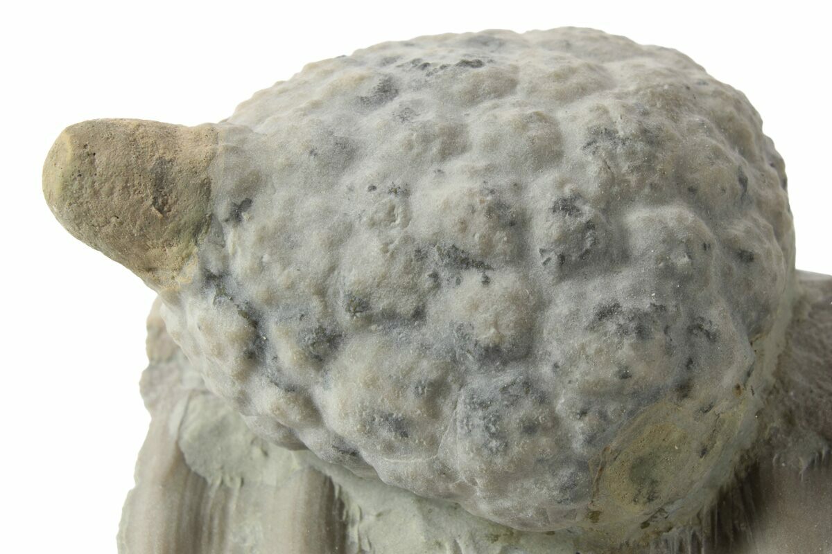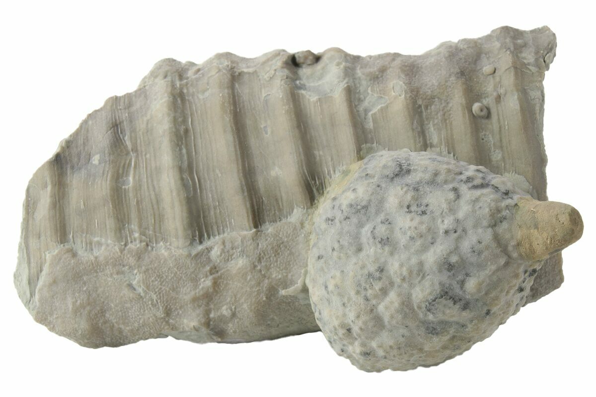 This is a 1.5" long fossil cystoid (Holocystites scutellatus) from the Silurian period Osgood Shale of Napolean, Indiana. It has been prepped free from the rock using air abrasives, and remounted back to this piece of rock that contains an unidentified (cephalopod?) fossil.