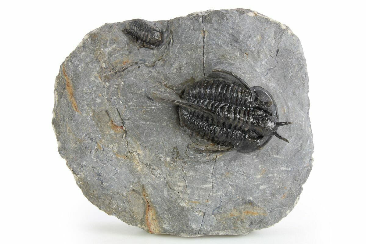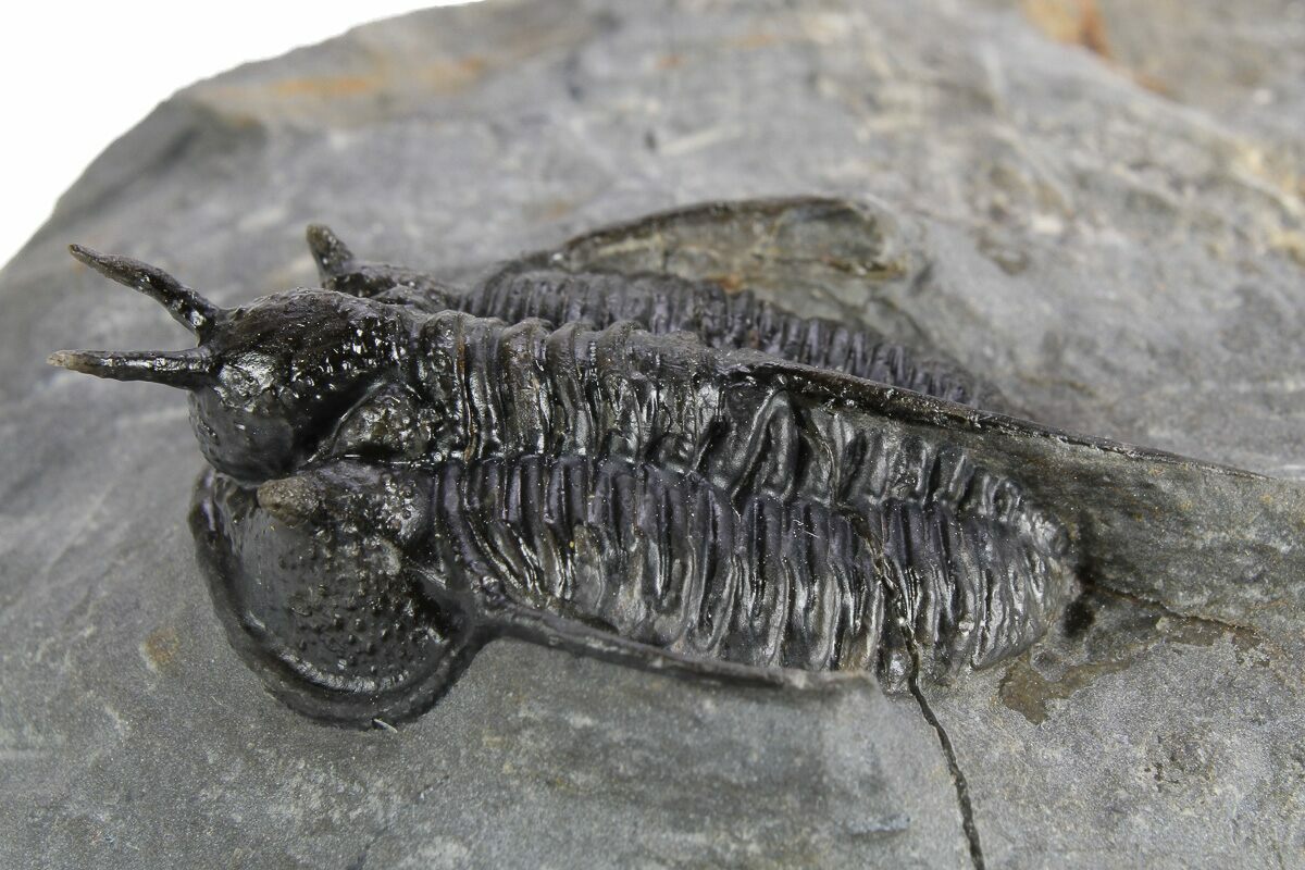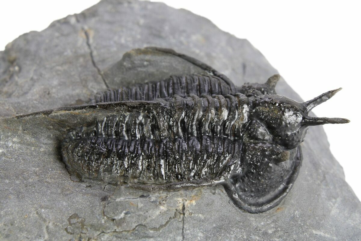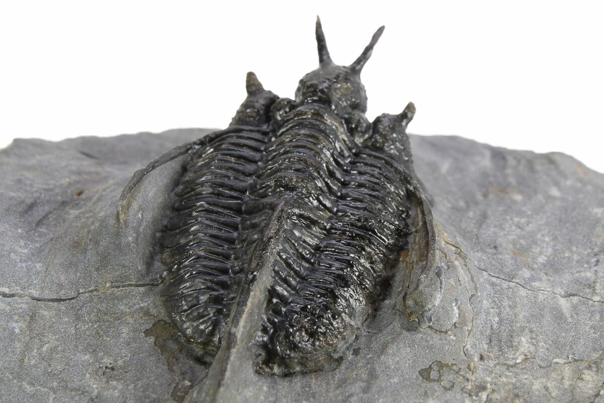 Here is nice example of the Devonian trilobite Cyphaspis walteri sometimes referred to as the "Devil Horn" Cyphaspis for obvious reasons. This is a nicely presented example of this spiny Moroccan Otarionidae trilobite. It has about 5% shell restoration including the right genal spine and right horn.