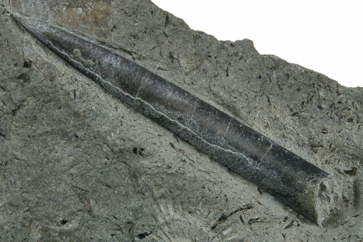 This is a 1.5" long fossil belemnite (Youngibelus cf. gigas) rostrum from the Jurassic age Posidonia Shale of Holzmaden, Germany. The belemnite has been exposed from the rock it was found in and is preserved alongside faint Dactylioceras ammonite fossils.