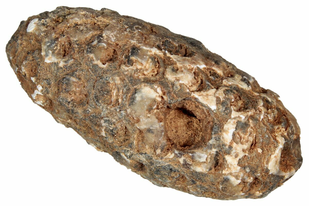 These seed cones found in the Western Sahara of Morocco have are a bit of a mystery and have not yet been described. They are often labeled is "pine cones" and there has also been speculation that they might be aggregate fruits or horsetail seed pods. But, most likely these silica-replaced (agatized) fossils are the seed pods of Cycadophytes. These fossil cones often bear the signs of insect predation, being partially eaten.