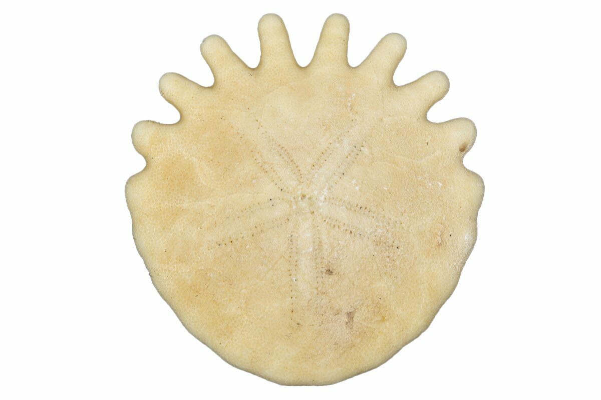 A sand dollar is a highly flattened form of urchin of the order Clypeasteroida. As an echinoderm, they have a pentameral (five-fold) symmetry to their body organization, a water vascular system, and an endoskeleton made of calcite plates. They live in shallow marine environments just below the low tide line, buried in the sand or mud. They range up to about 4 inches (10cm) in diameter. Most are about a third (7mm) to half (12mm) an inch thick, but some are over an inch thick. They are basically circular in shape, though some have flattened or indented sides. While alive, they are covered with velvety-looking spines that they use to move, much like other echinoderms. The most diagnostic indicator of fossil sand dollars is the five ovate form on the top side of the skeleton. These are part of the respiratory system and leave an easily identified “flower” on the skeleton. They are active predators, feeding on crustacean larvae, small copepods, diatoms, and algae.