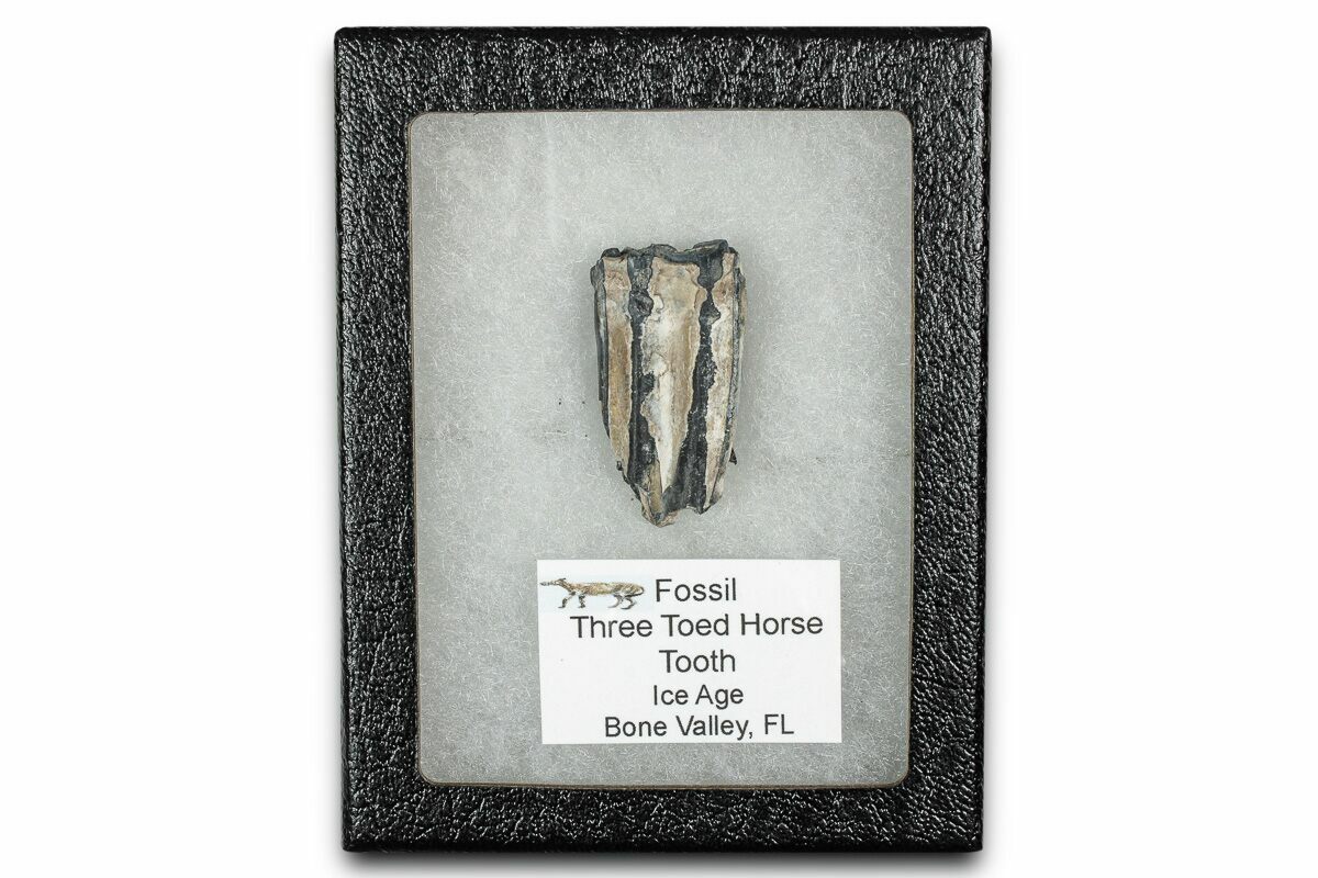 This is a 1.5" long Pliocene/Miocene-aged fossil three-toed horse tooth collected in Bone Valley, Florida. These teeth are commonly found associated with fossils from many other Late Miocene and early Pliocene (ice age) mammals. It is accompanied by a riker mount display case.