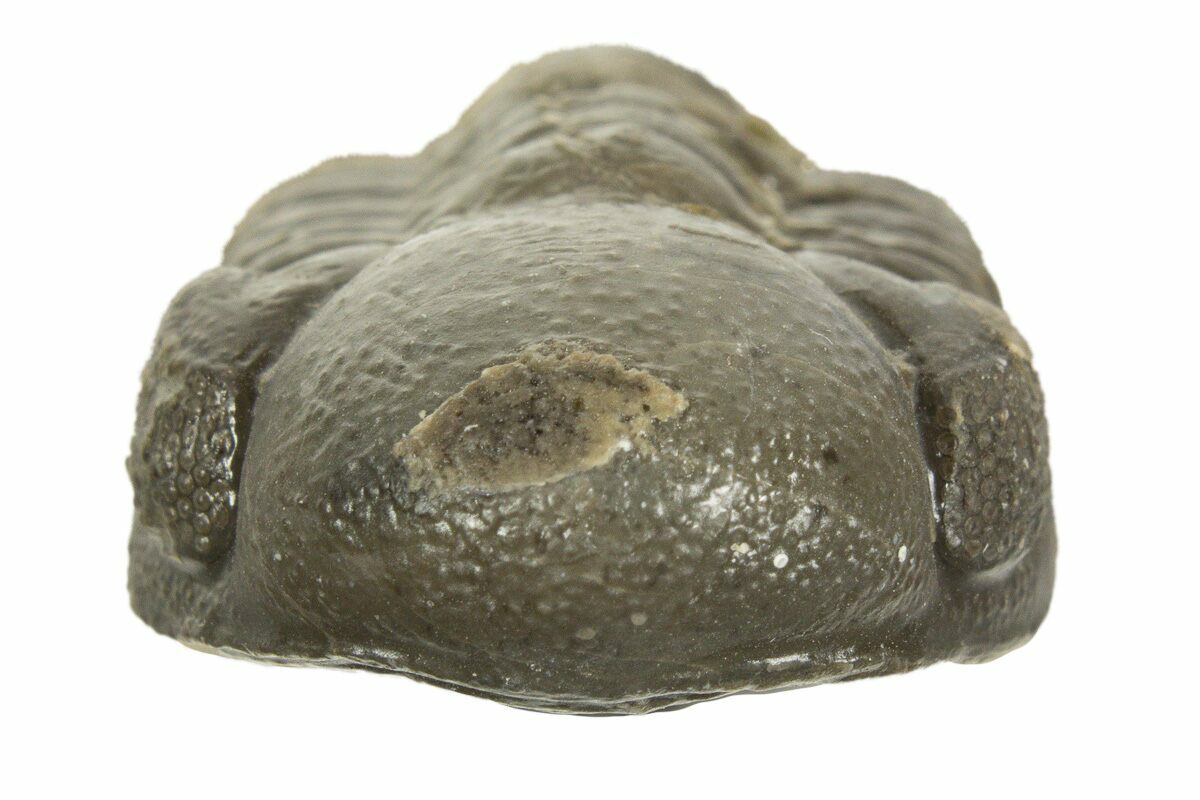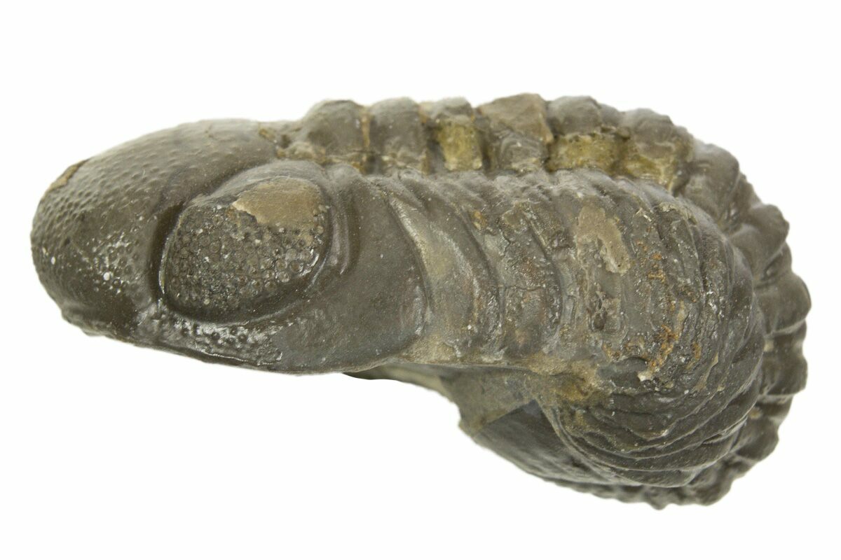 This is a curled, 1.5" long Austerops trilobite from Ofaten, Morocco. There is some damage and restoration of the left eye though the eye facets are excellent in the right eye.