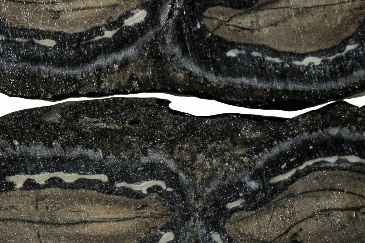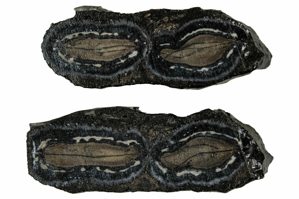 These are two cross-sectional slices of a Columbia Mammoth (Mammuthus columbi) molar collected from the coastal region of South Carolina. They come in a Riker mount display case.