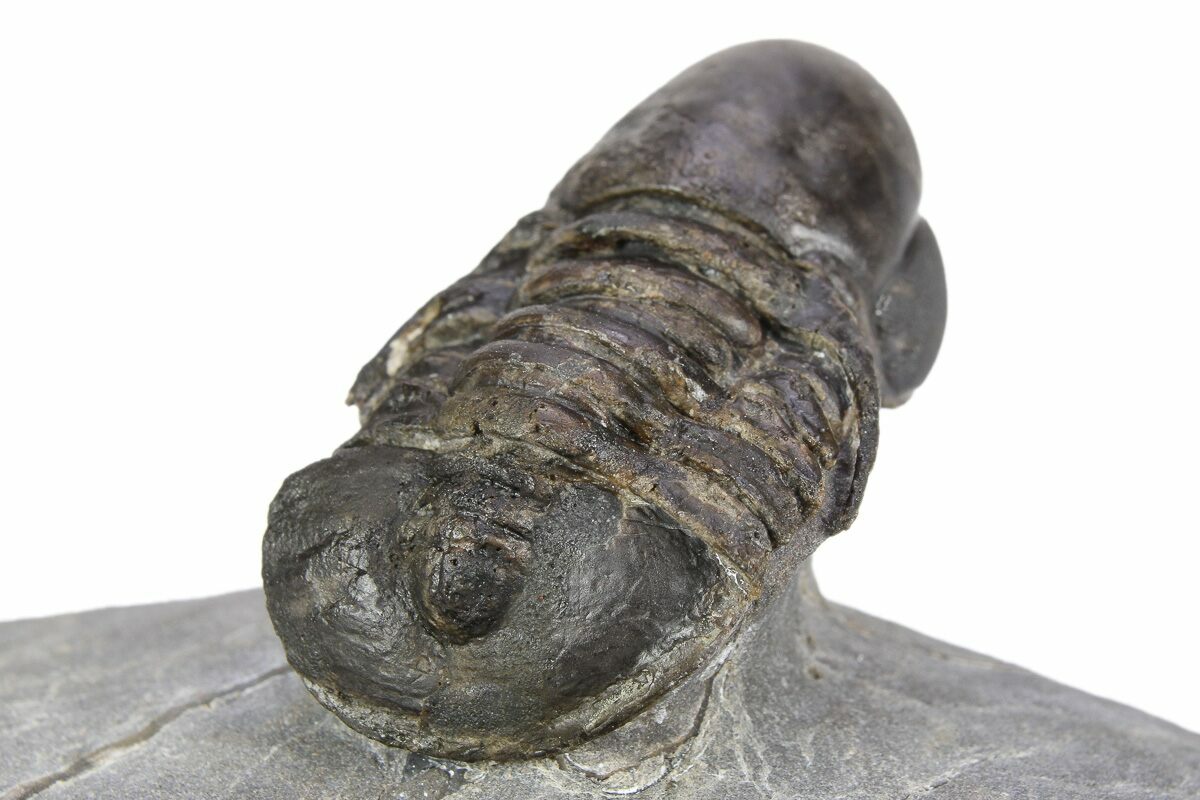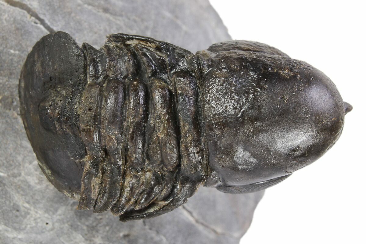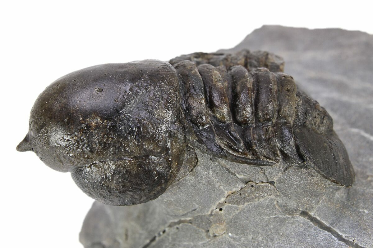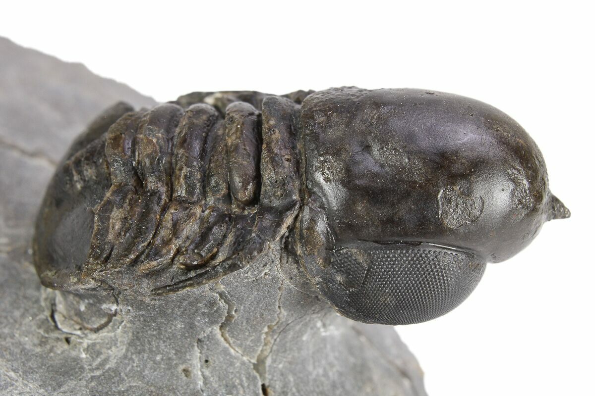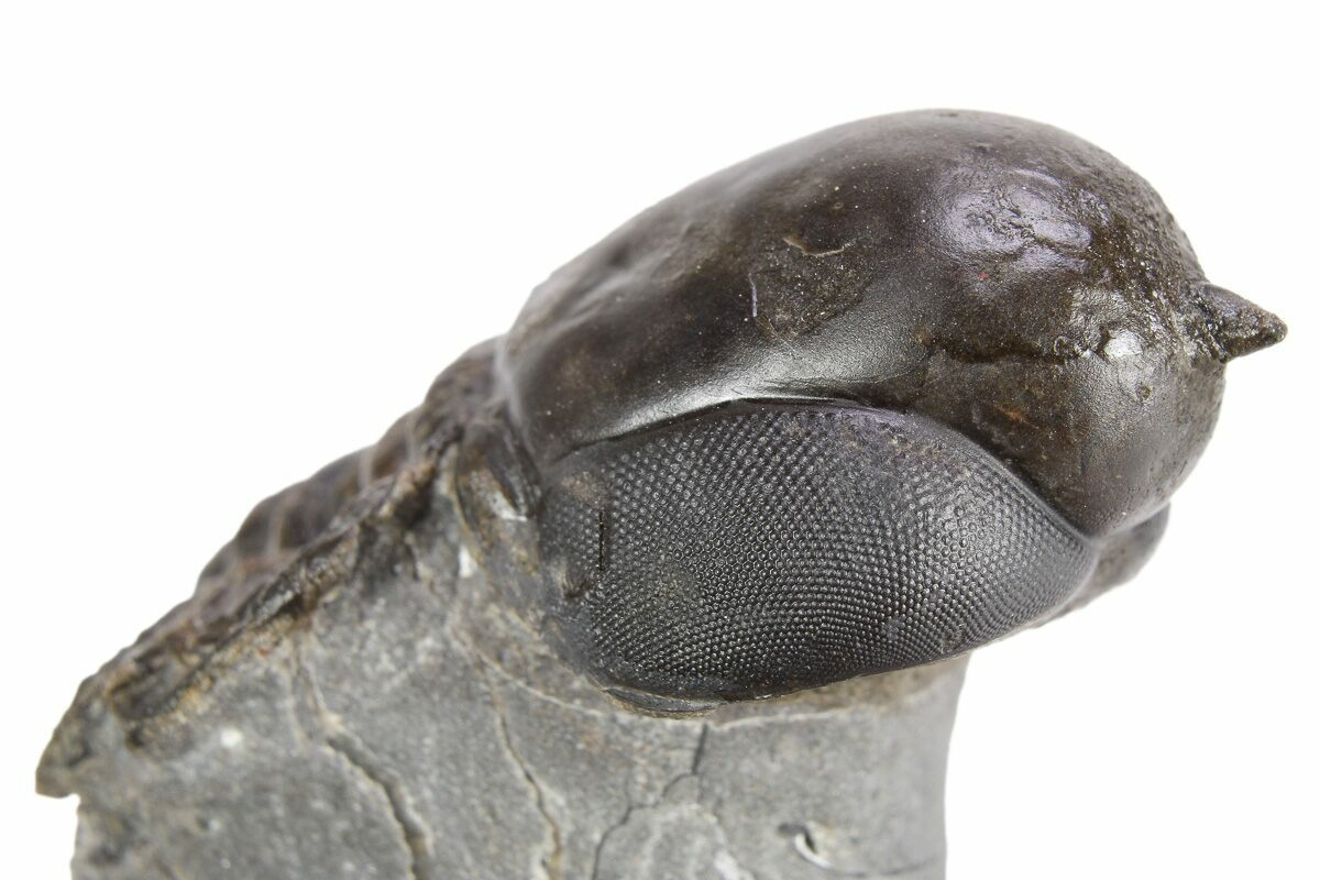 This is an exceptional, 1.5" long example of an unusual pelagic trilobite (Cyclopyge) from El Kaid Rami, Morocco. Nearly all of the Cyclopyge you see from Morocco are flattened on shale and not 3D like this specimen. The right eye on this one is incredible, though the left does not preserve much detail. It has some restoration along repaired cracks.