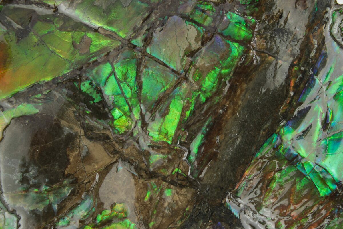 Ammolite is an opal-like gemstone found primarily in Alberta, Canada. It is a kind of fossilized shell from ammonites, which in turn are composed primarily of aragonite, the same mineral contained in nacre (mother-of-pearl). The shell's microstructures are often preserved. In 1981, ammolite was given official gemstone status by the World Jewellery Confederation (CIBJO).