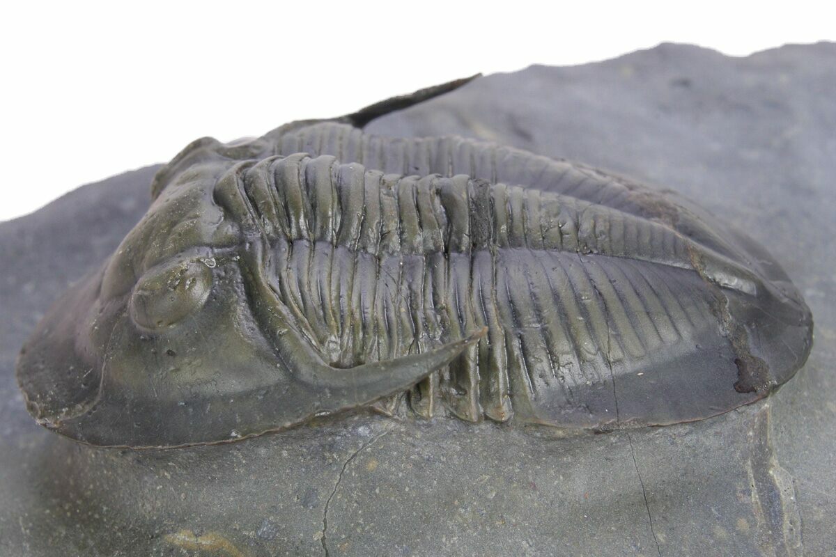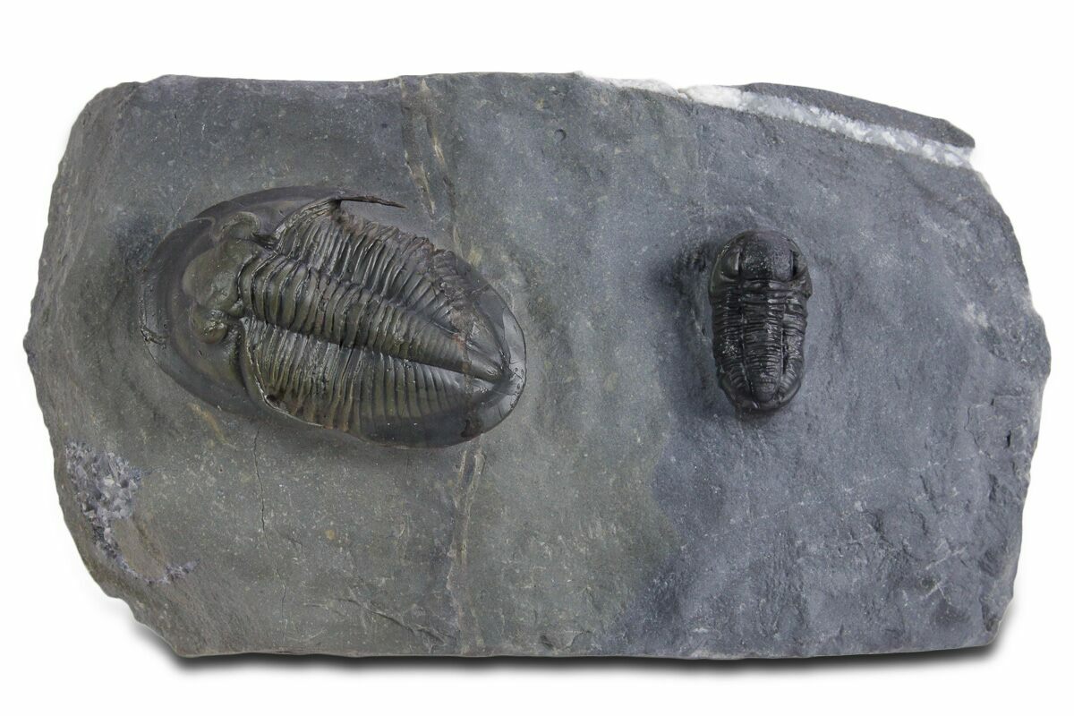 This specimen features an association of two different genera of proetid trilobites from the Drâa-Tafilalet region of Morocco. It includes a 1.9-inch-long Cyphaspis lemkei, a species that is quite rare to encounter, alongside a smaller Gerastos. Both trilobites have been carefully prepared to stand out in high relief against the surrounding limestone matrix. Approximately 5% of the shell has been restored, primarily along repaired cracks.