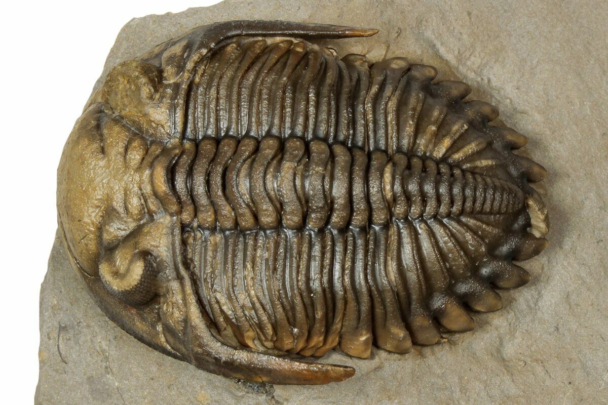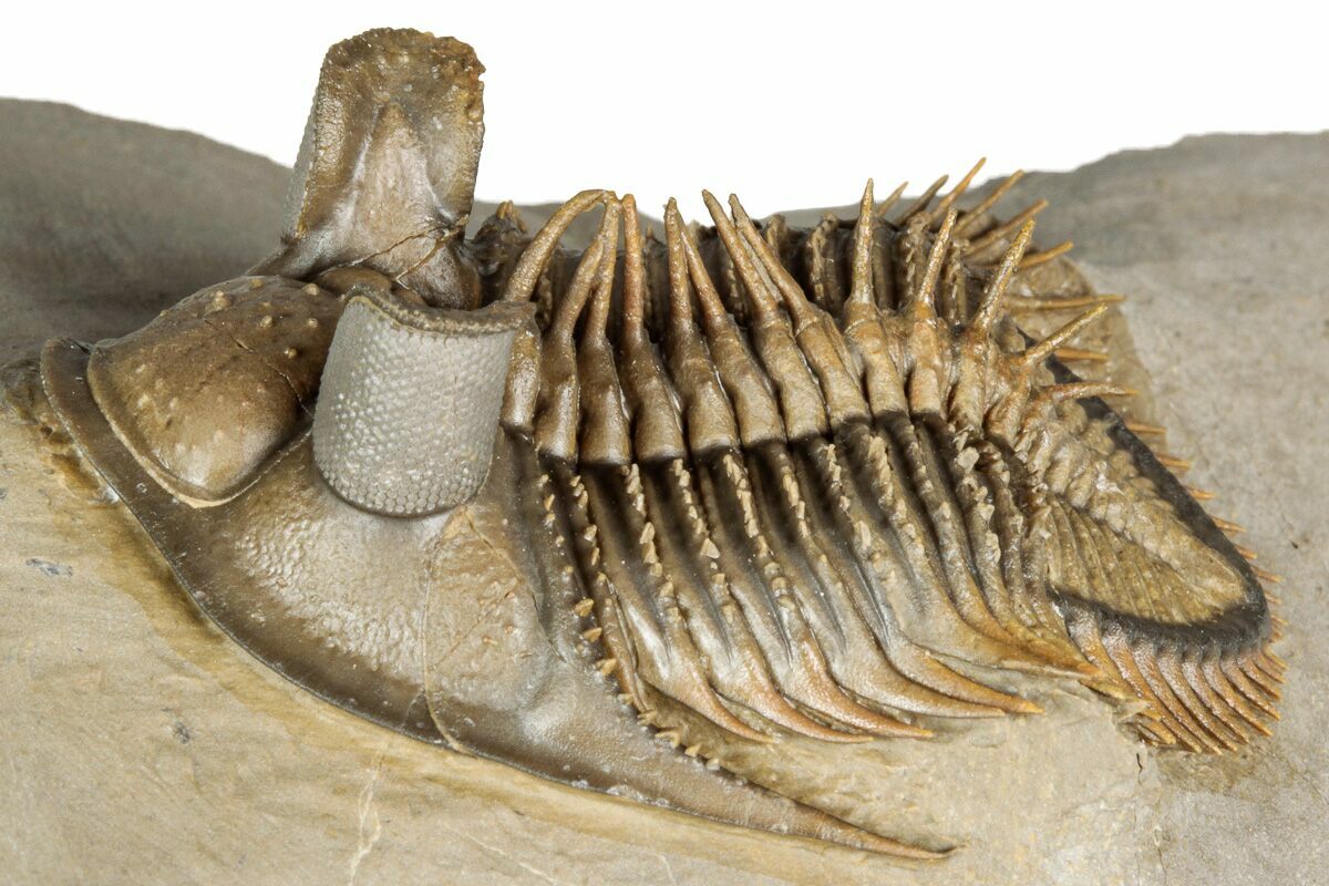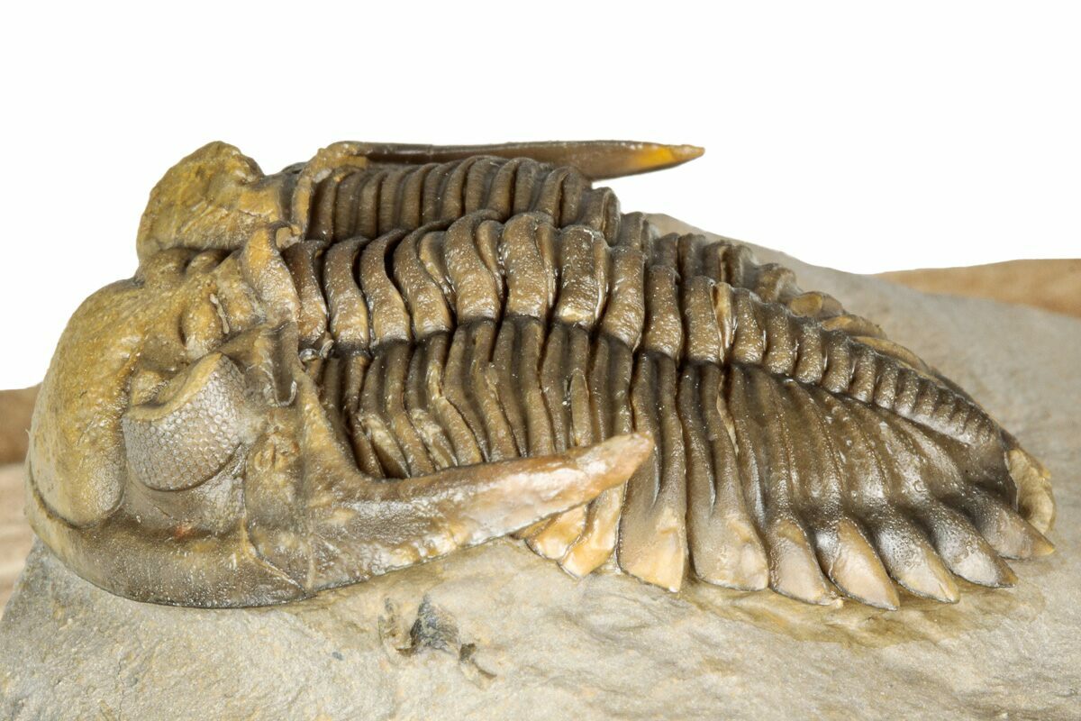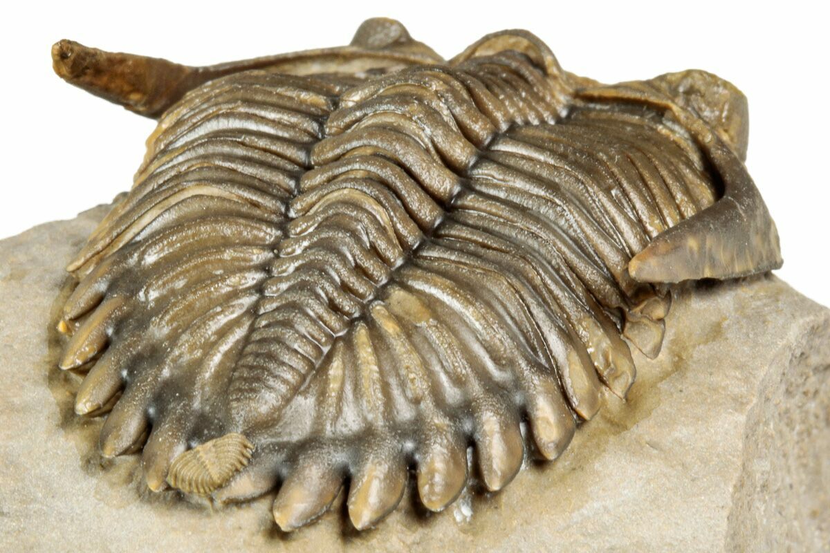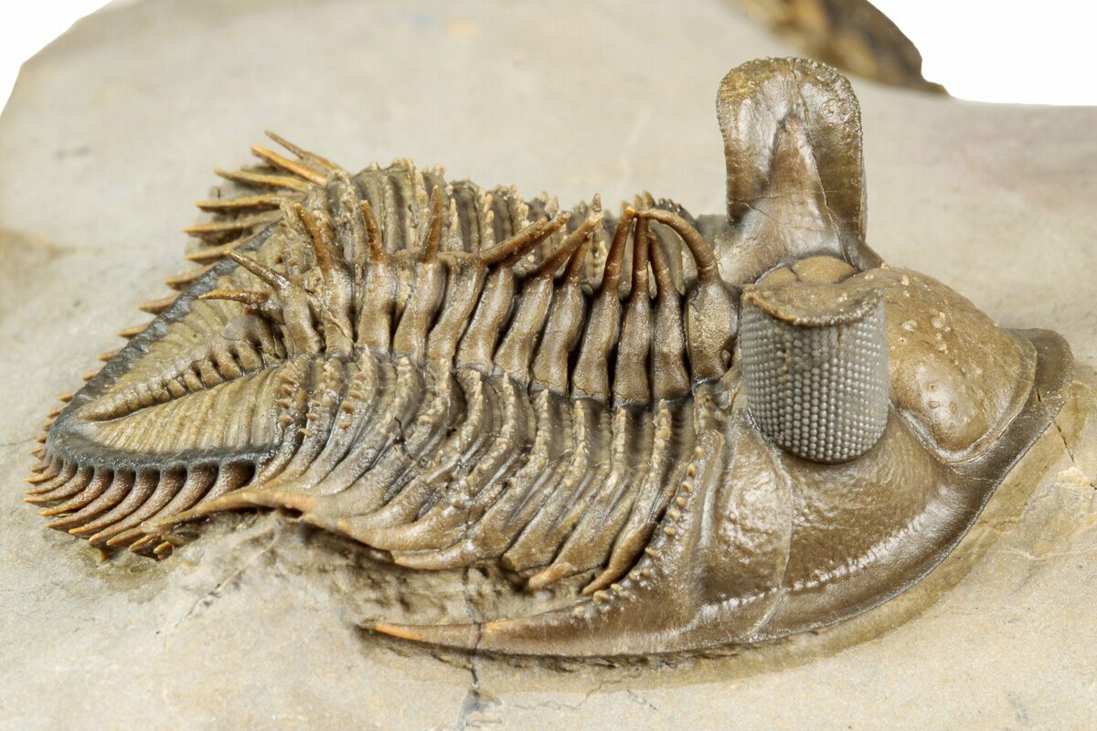 This is a stunning specimen of the tower-eyed trilobite Erbenochile from the Timrhanrhart Formation of Morocco. It measures 1.5" long and much of the limestone has been removed from the lateral spines. Even a tiny trilobite pygidium has been exposed and left attached to the pygidium of the Hollardops. Exceptional detail and preparation on this specimen. Just check out the facets in the tower eyes and all of its tiny spines.