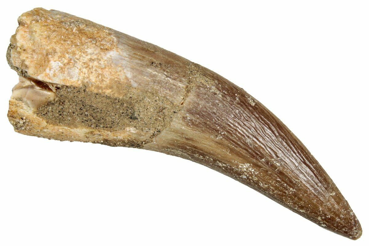 This is a 1.51" tooth from the Cretaceous marine reptile Zarafasaura oceanis, a long-necked plesiosaur known from the phosphate-rich Oulad Abdoun Basin of Morocco. The enamel displays nice preservation and natural coloration.