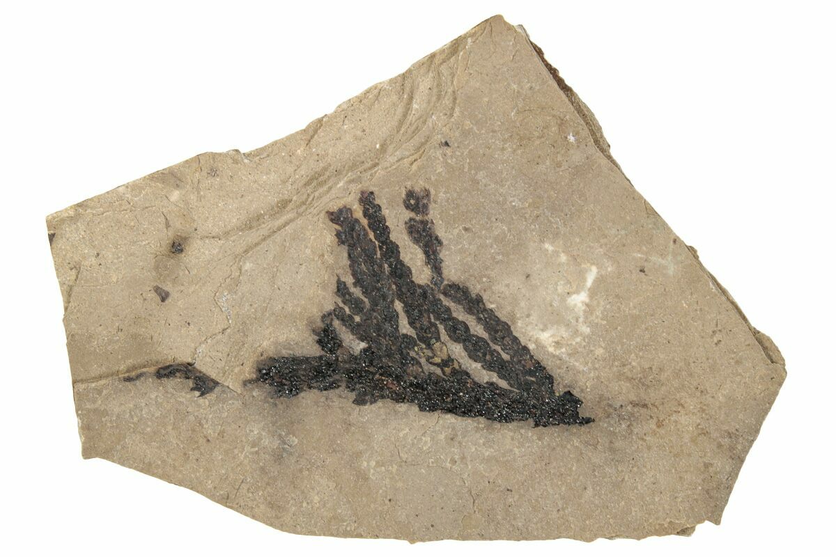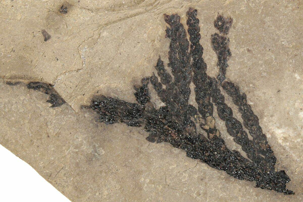 This is a 1.55" conifer fossil branchlet from the McAbee fossil beds of British Columbia, Canada. The specimen is either from the genus Thuja or Chamaecyparis, as both are found frequently in the McAbee Beds and have extremely similar morphology.