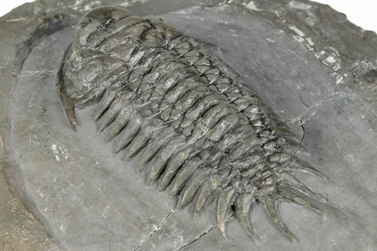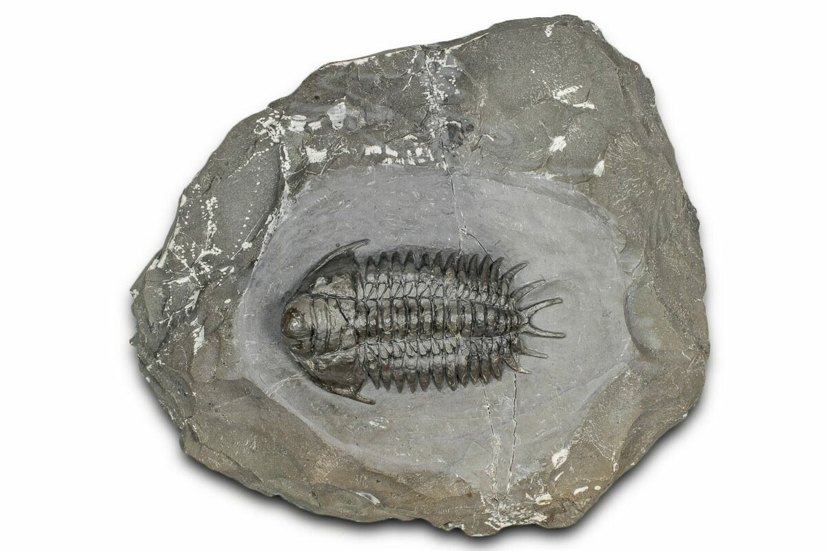 This is an uncommon, 2.35" long Crotalocephalus trilobite from the Bou Tchrafine Formation at Jorf, Morocco. It is laid out nice and prone with only a small area of restoration on its glabella.