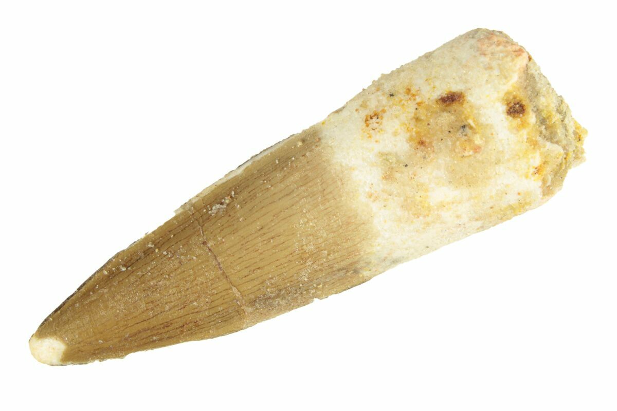 Spinosaurus teeth are relatively common fossils, but large (3+ inches), well-preserved examples are rare. These large Spinosaurus teeth will often be heavily doctored. We’ve seen many examples where multiple partial teeth can been glued to together to create a larger fake tooth, or where enamel has been painted on. One giveaway to look for is a ring of sand around the middle of the tooth, usually glued on to hide a break. Sometimes this is a sign that multiple partial teeth have been composited, but other times it is used to disguise a badly done repair job.