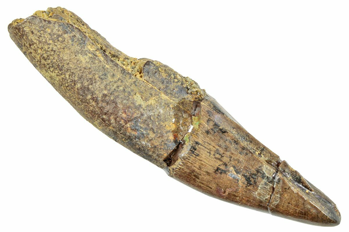 The tooth is 1.57" long and likely would have come from either Tyrannosaurus rex or Nanotyrannus lancensis. There is a repaired crack between the crown and root, along with another repaired crack near the apical end of the tooth.