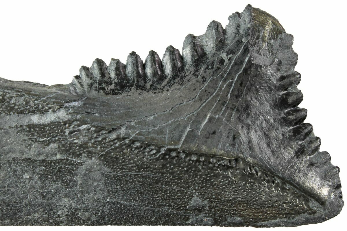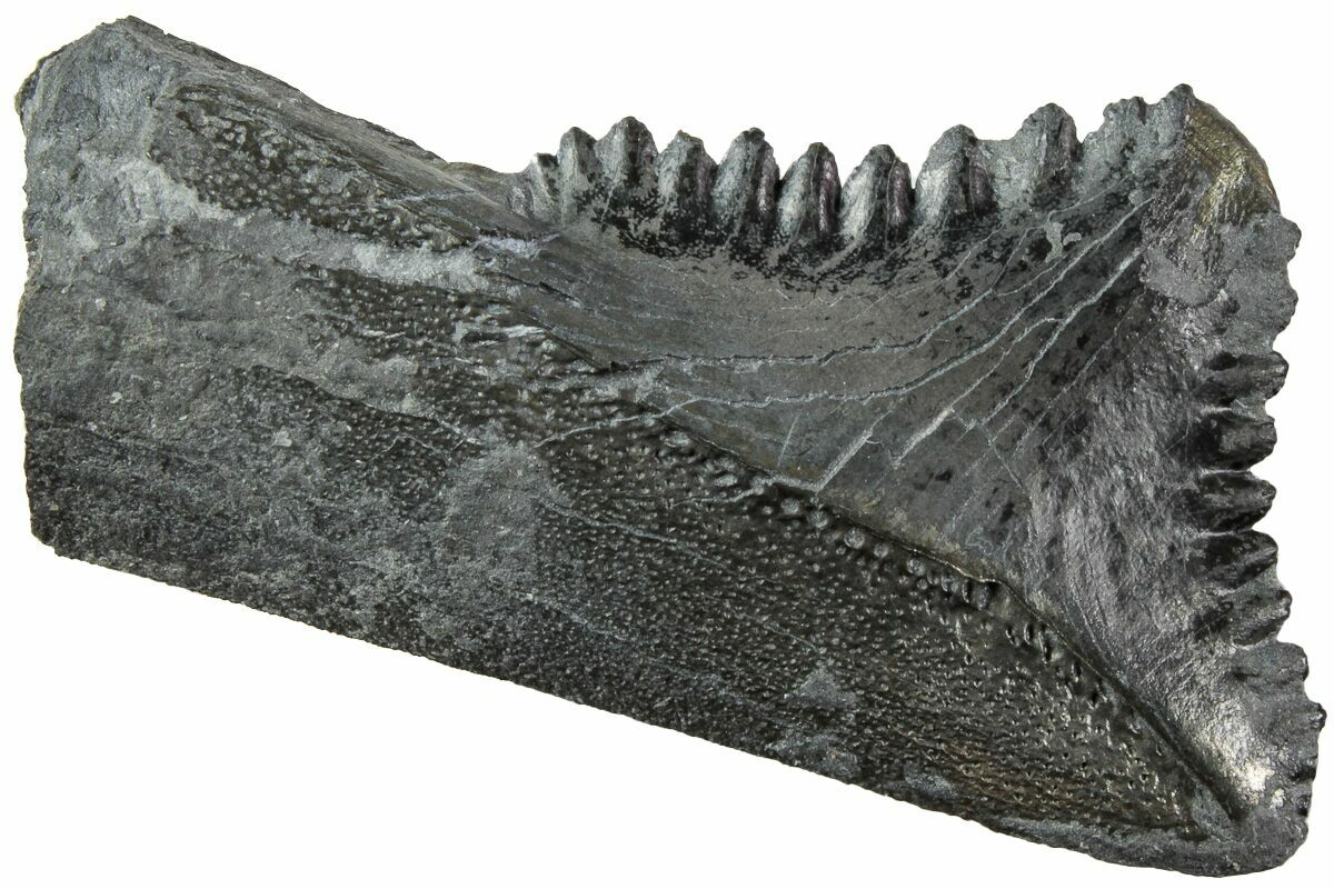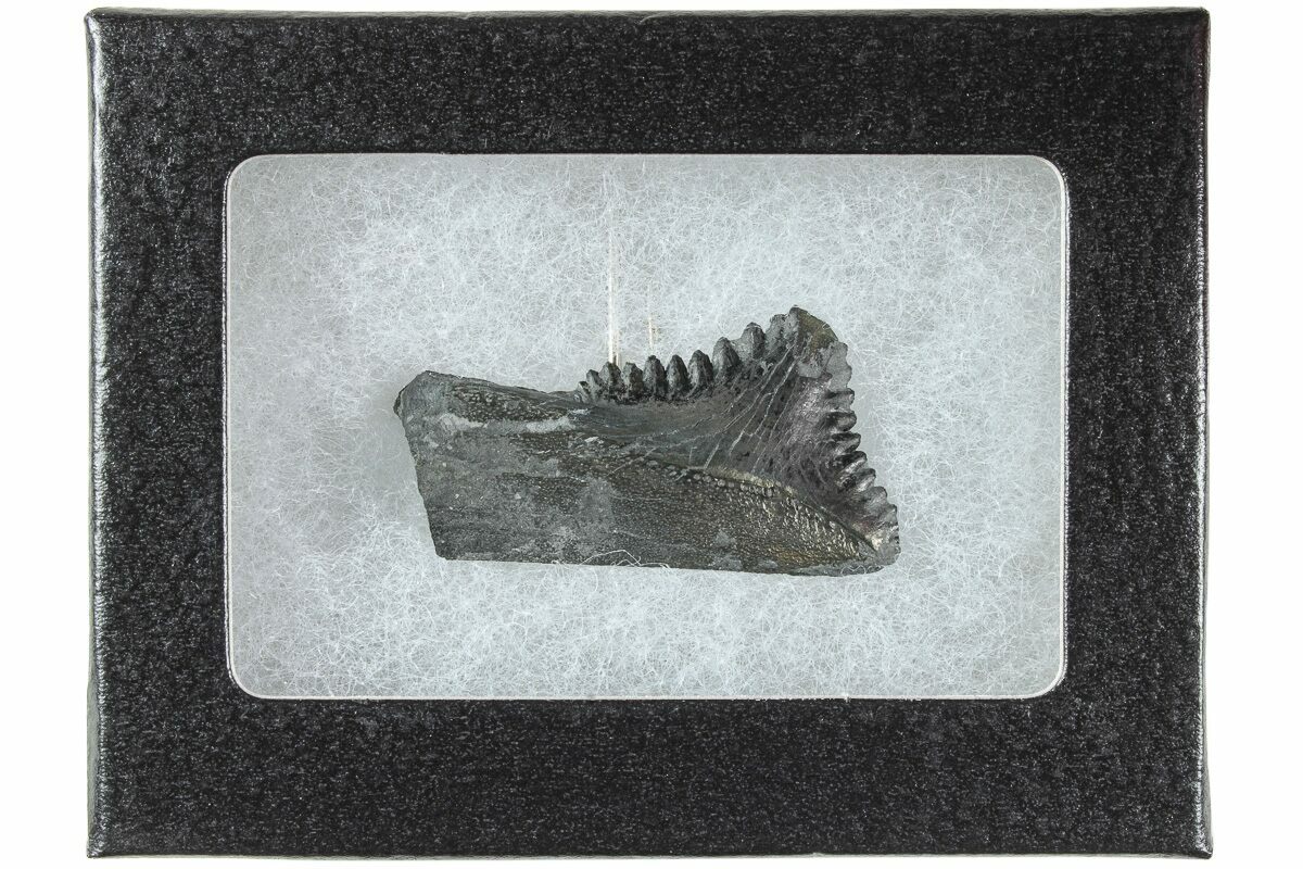 This is a very unusual and hard to acquire offering of a fossil tooth and jaw section from the Carboniferous-aged shark, Edestus heinrichi. These rare teeth are recovered deep underground in the coal mines of Illinois. The tooth is in excellent condition with glossy black-grey enamel preservation, well defined serrations, and a metallic luster in spots as a result of pyrite replacement. Most of these teeth are found broken or worn.