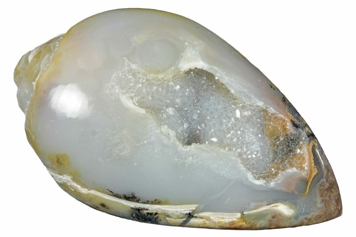 This is a stunning chalcedony replaced gastropod fossil from Betul, India. This specimen has been polished to reveal the once hollow cavity of the shell that has been filled with a pocket of beautiful druzy quartz crystals. It has also been cut flat on the back side so that it displays nicely on a flat surface.