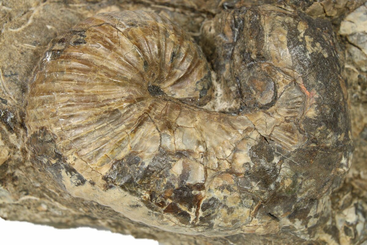 The ammonite has been painstakingly exposed from the hard mudstone surrounding it. The rock also contains a variety of shell fragments. Comes with an acrylic display stand.