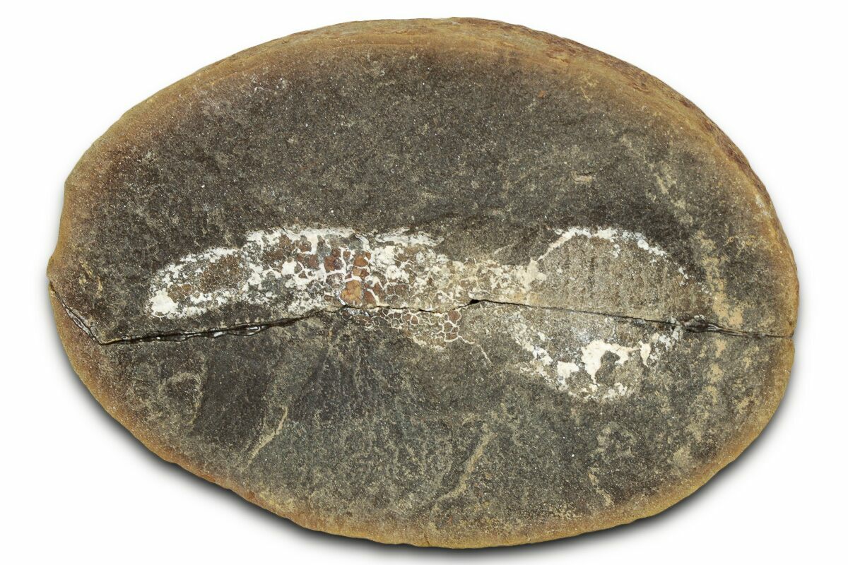 Both the positive and negative sides of the fossil are included. There is a repaired crack through one half of the nodule.