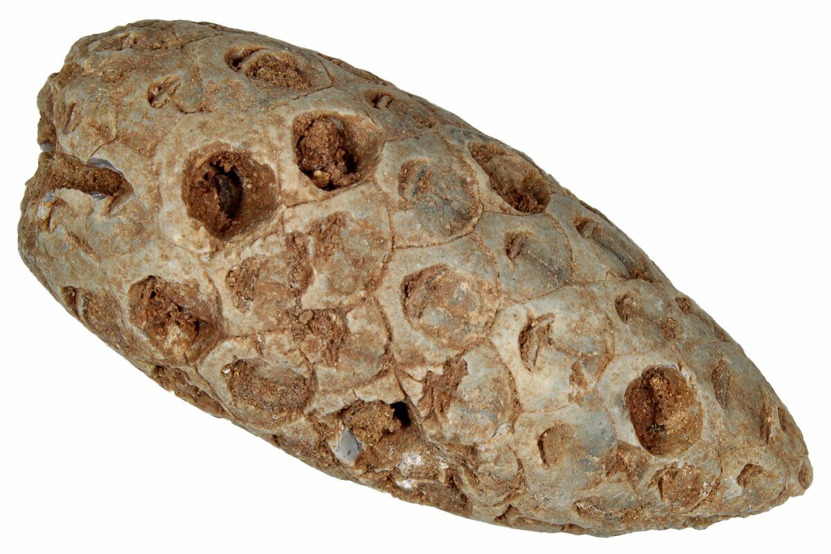 These seed cones found in the Western Sahara of Morocco have are a bit of a mystery and have not yet been described. They are often labeled is "pine cones" and there has also been speculation that they might be aggregate fruits or horsetail seed pods. But, most likely these silica-replaced (agatized) fossils are the seed pods of Cycadophytes. These fossil cones often bear the signs of insect predation, being partially eaten.